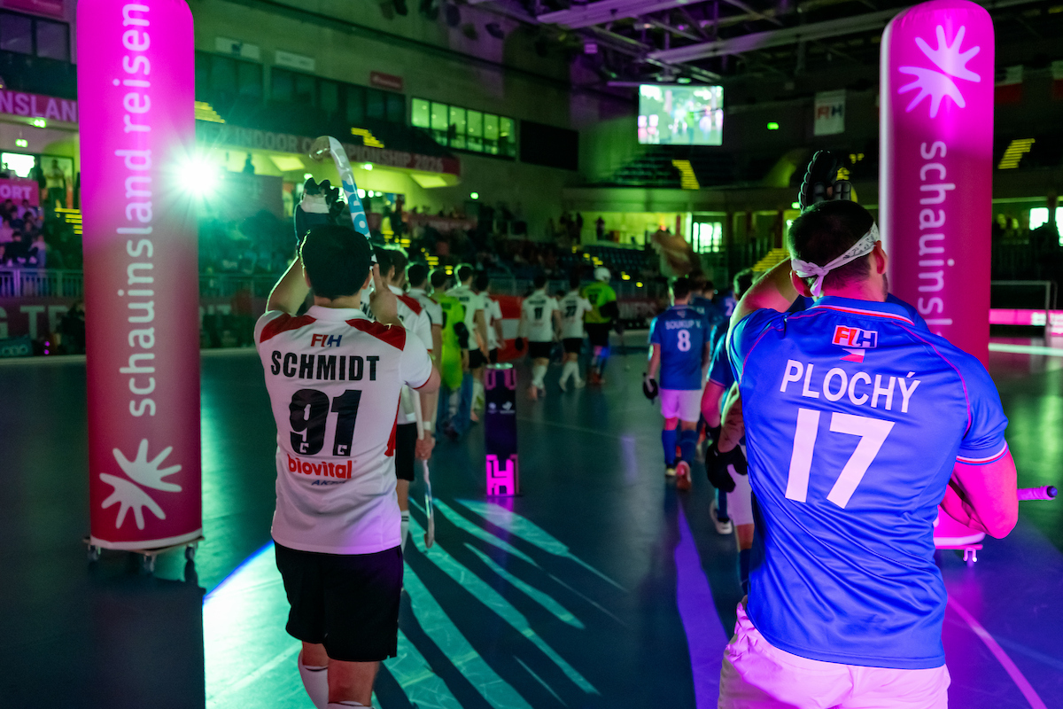 Die Lichter gehen aus in er Halle - die Scheinwerfer sind auf die Mannschaften gerichtet, die soeben in die Halle einmarschieren. Österreich startet mit Szymczyk, Hasun, Kölbl, Kelner, Wellan, Losonci. Tschechien hat Anstoss.