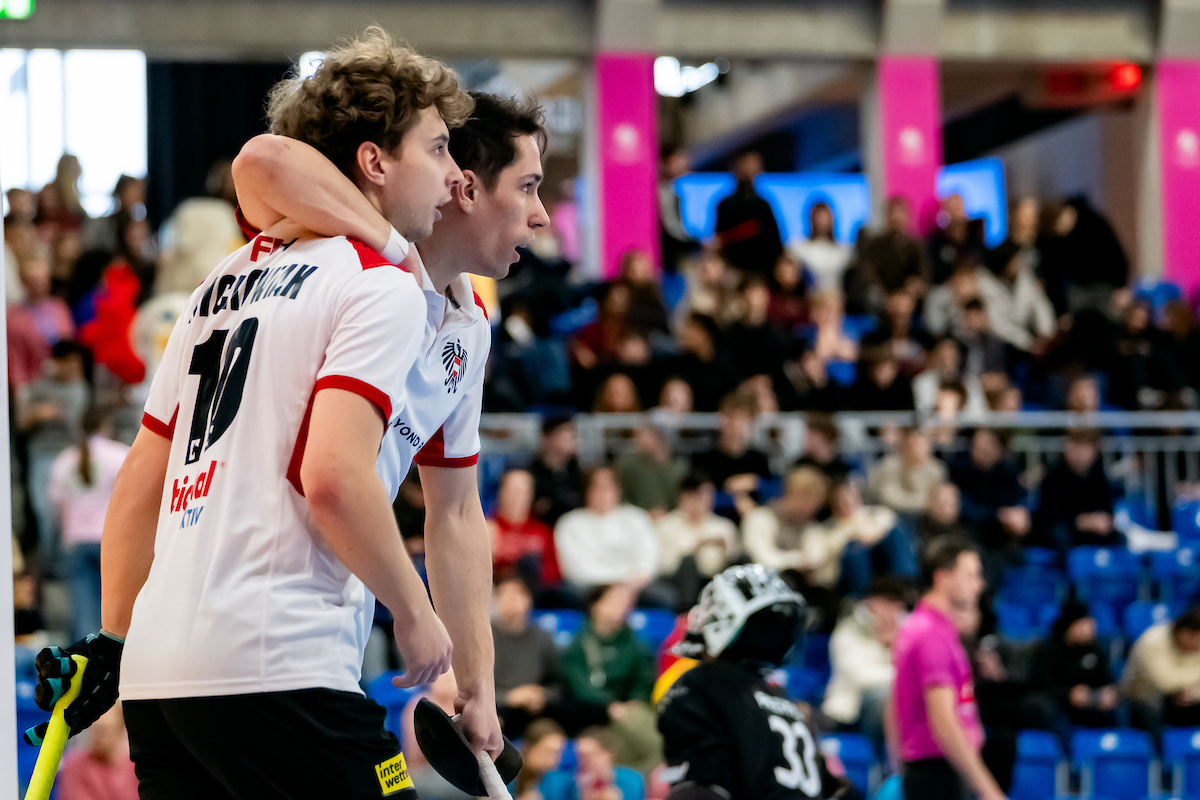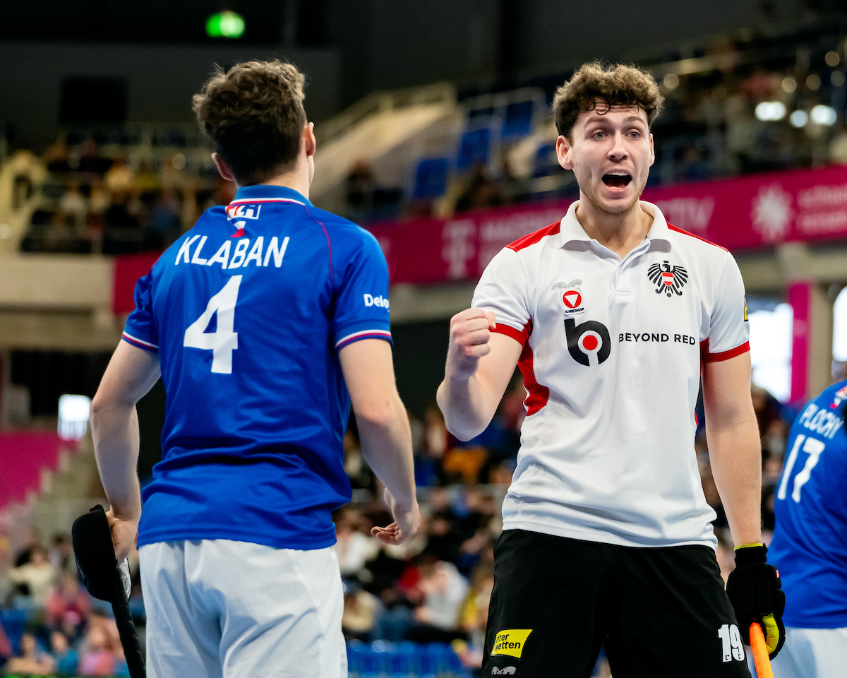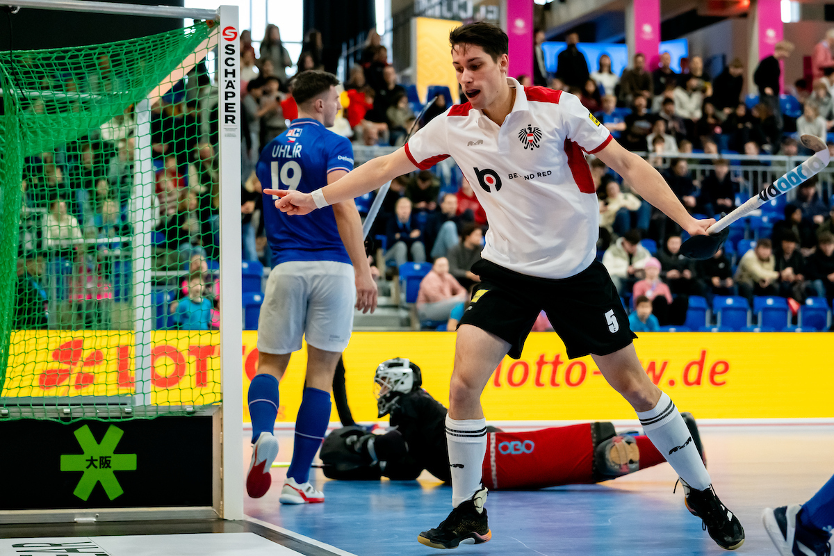 Überzahl für Österreich in der 28. Minute. Xaver Hasun kommt kurz vor dem Kreis an den Ball. Er legt seine gesamte Energie in einen entschlossenen Scheibeball auf das Tor und aus einem fast unmöglichen Winkel trifft er mitten durch die Beine des Keepers. Das ist das 3:2 für Österreich.
