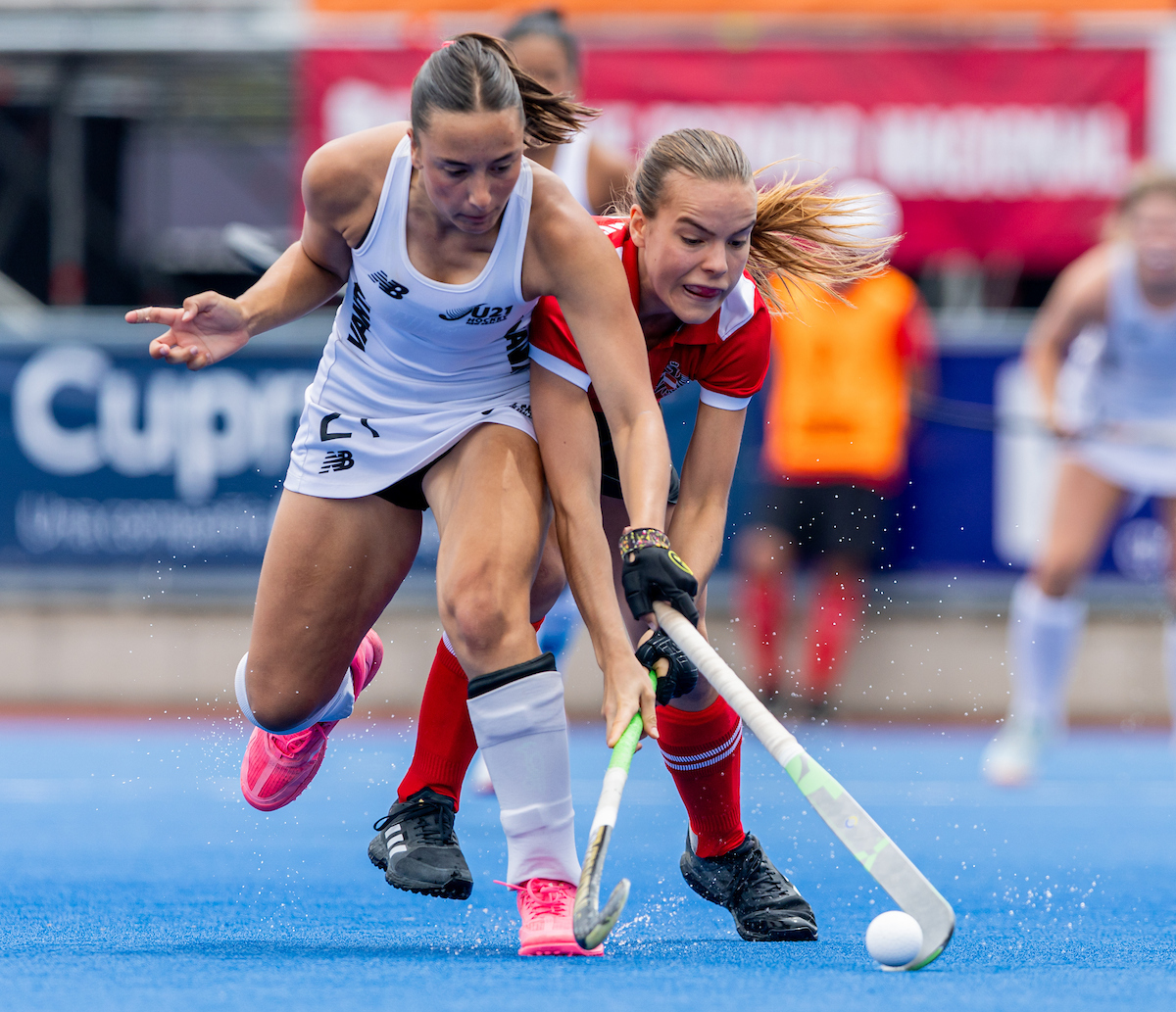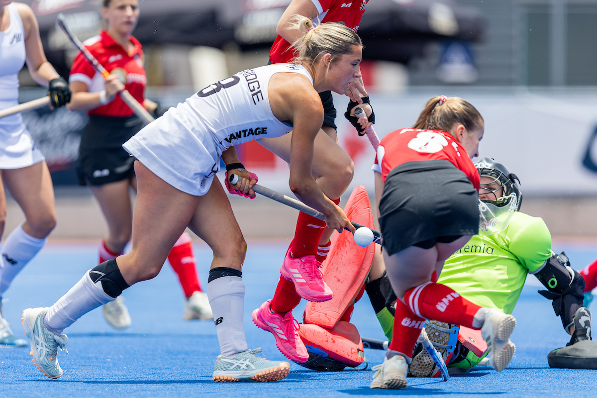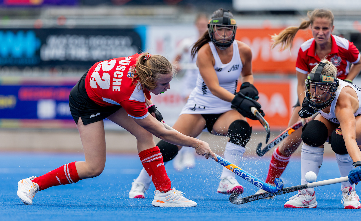 Dann hat Katharina Proksch viel Glück - kompromisslos zieht eine Gegenspielerin bei einem hohen Ball im Schusskreis durch und trifft mit dem Ball ihre Hand. Scheinbar keine schlimmere Verletzung, denn sie spielt weiter. Und dann ist Halbzeit.