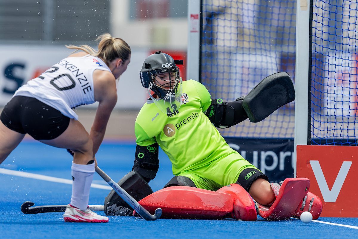 8 Minuten und Katharina Proksch agiert zwei Mal unglücklich - zuerst springt ein Ball an den Körper. Dafür gibt es Strafecke für Neuseeland. Dann lenkt sie den Ball beim Herauslaufen so ab, dass er unhaltbar im Tor landet. Sehr unglücklich nach einem wirklich guten Start der österreichischen Mannschaft.