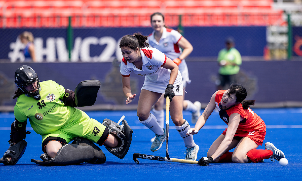 Aber im zweiten Viertel schleichen sich immer wieder Fehlpässe ein und Korea kommt zu einer Riesenchance in Minute 18 und kurz danach zur nächsten Strafecke wegen fehlendem Abstand bei einem koreanischen Freischlag. Wiederholung und Michaela Streb hält. Dann ist es eine Stürmerin von Korea, die freistehend vor dem Tor den Ball nicht unter Kontrolle bringen kann. Österreich unter Druck in dieser Phase.