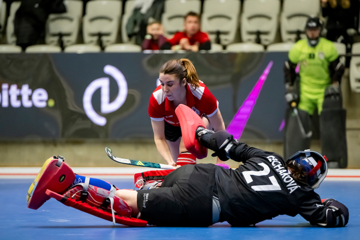 Bauer kommt in den Kreis, aber der Schuss zu schwach und flach. Dann kontert Daria Buchta mit Pass auf Laura Kern und das bringt die Strafecke für Österreich. Zwei Versuche ohne tschechische Torfrau, aber Tschechien kann abewehren, einmal davon direkt auf der Linie.