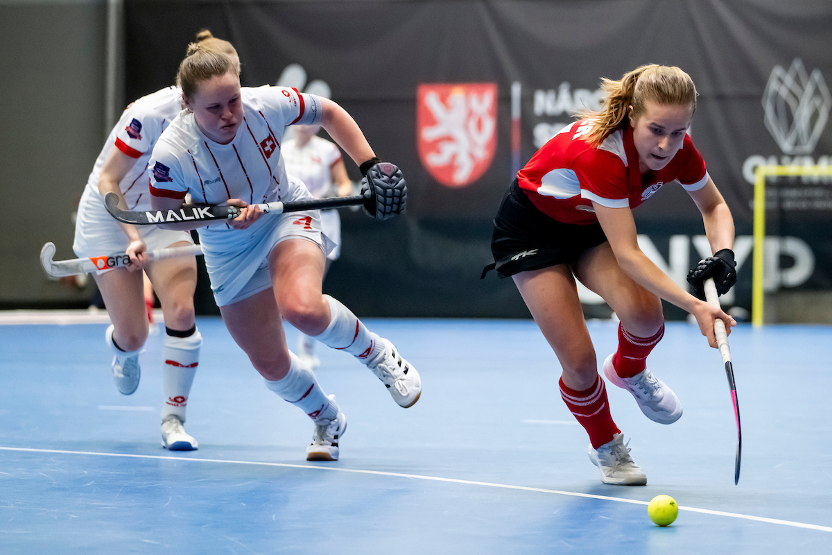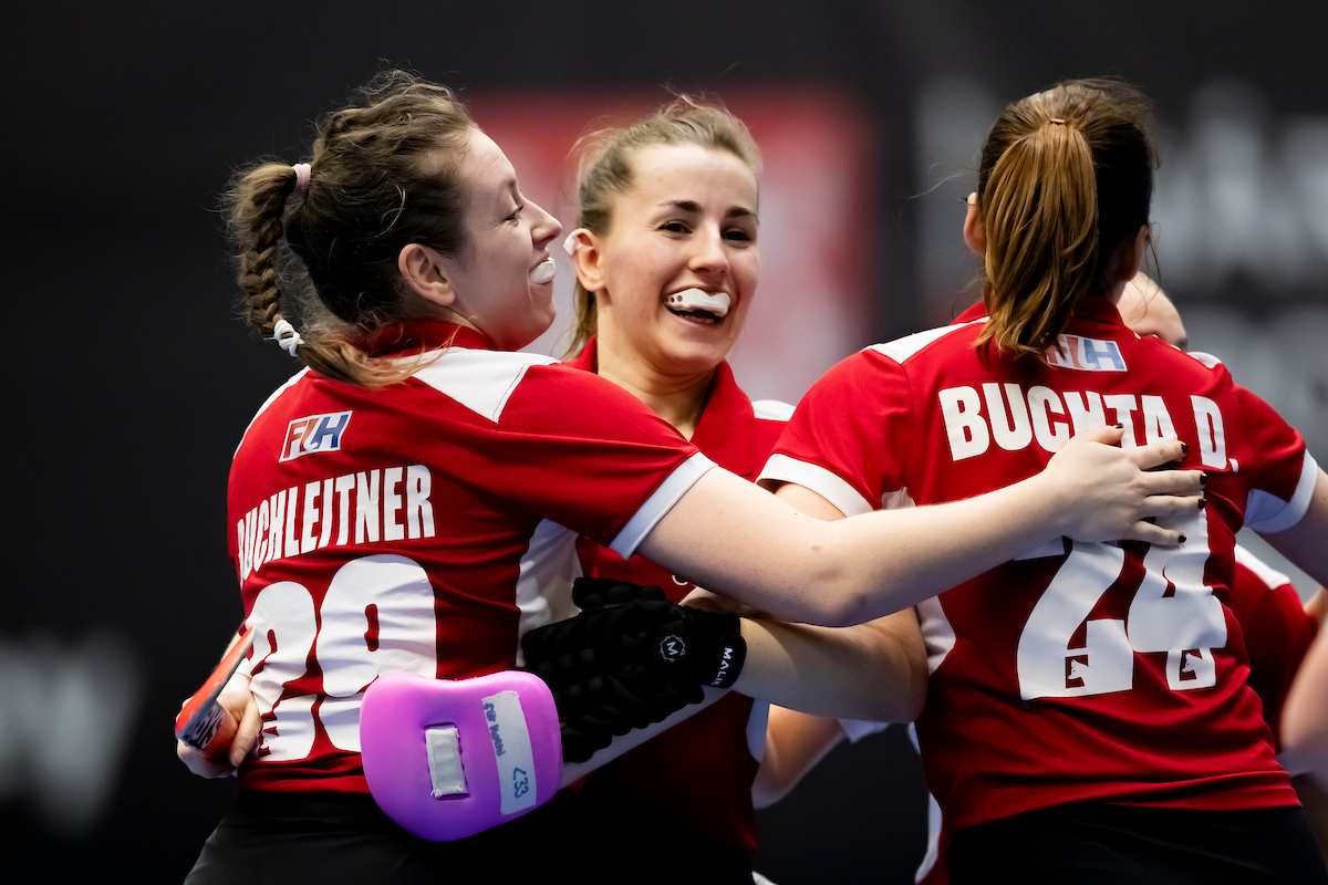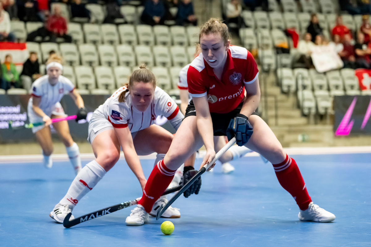 Katharina Bauer findet den Fuß der Gegenspielerin in der 15. Minute und holt die erste Strafecke für Österreich. Mutig läuft die Schweiz aus dem Tor, direkt in den Schlenzball von Marie Hahnenkamp. "Safety first" und der Torschuss wird abgepfiffen.