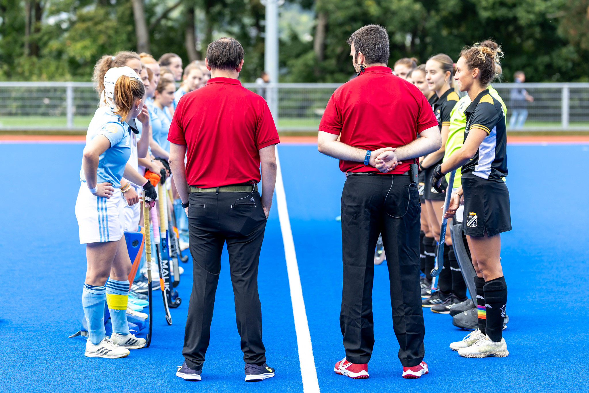 SV Arminen erwischt den besseren Start im Topspiel der Damen-Bundesliga. Die Schwarz-Weißen kombinieren flüssig, halten den Ball lange in den eigenen Reihen und setzen den AHTC früh unter Druck. Was fehlt, sind die zwingenden Abschlüsse. Eine Strafecke führt zu einer Folgeecke, weil AHTC zu früh herausläuft, doch diese wird verstoppt und die Chance ist dahin. Dann läuft Marie Pelz nach gutem Kombinationsspiel frei auf die gegnerische Torfrau zu, scheitert aber im direkten Duell.