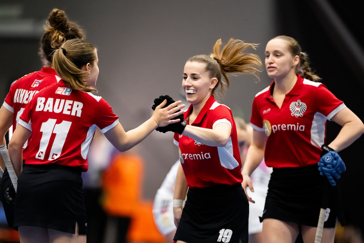 Dann eine Bilderbuchaktion für ein mögliches Tor des Turniers. Zuerst holt sich Johanna Czech mit einer perfekten Attacke an der linken Bande den Ball und startet einen Konterangriff durch die Mitte - Pass auf Katharina Proksch an der linken Bande und die legt nochmals zur Mitte ab und Czech kann ihren Angriff mit einem Tor selbst abschließen. 4:2 für Österreich in Minute 28.