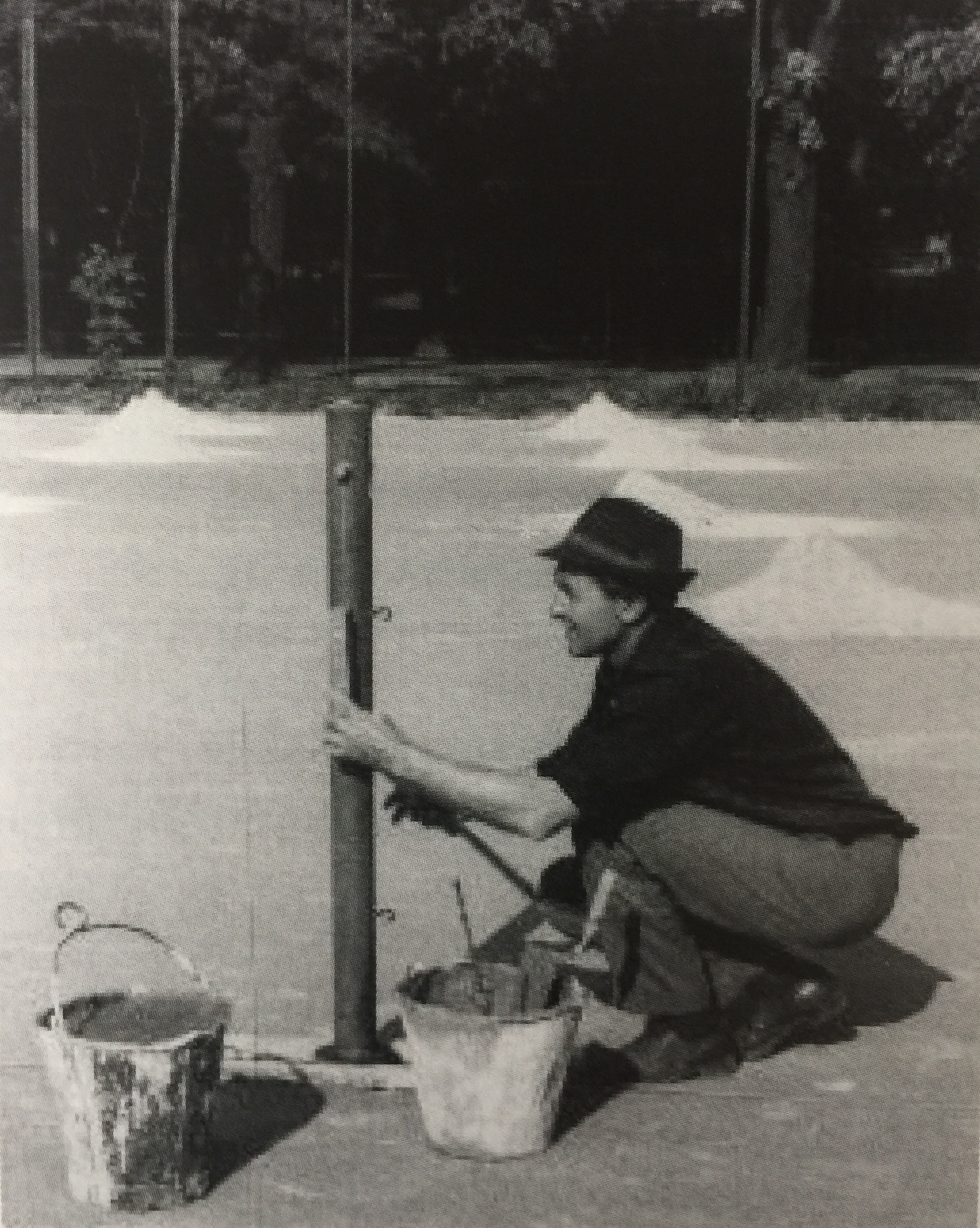 Im Verband stand man anfangs meinen Absichten recht skeptisch gegenüber, obwohl man von der Notwendigkeit des Vorhabens an sich ebenso überzeugt war wie ich. Ich hielt zunächst Ausschau nach passenden Grundstücken und konnte auch bald dem Wiener Magistrat vier Vorschläge unterbreiten, die allerdings nicht akzeptiert wurden. Aber als Gegenvorschlag verwies man auf das Gelände des 3. Kaffeehauses in der Prater Hauptallee, ein rund 24.000 qm großes Stück Land, das von Bomben zerwühlt, mit Bergen von Schutt überhäuft und von Buschwerk überwuchert war. Hinter diesem Chaos verbarg sich aber gerade das, was mir vorgeschwebt war: Wiens Hockey Stadion in schönster Umgebung und äußerst verkehrsgünstig gelegen. Ich ließ nicht mehr locker und fand bei den Herren des Vorstandes, dem ich damals noch nicht angehörte, besonders aber bei Präsident Klee volle Unterstützung und den Mut, dieses Wagnis - und ein solches war es angesichts der Größe und Kostspieligkeit des Projektes - zu unternehmen. Bald war der Pachtvertrag abgeschlossen, und am 2. März 1953 wurde der erste Spatenstich getan, dem zehn Jahre Arbeit an der Anlage folgten. 18.400 freiwillige Arbeitsstunden leisteten die Mitglieder des Verbandes allein im Gelände, Handwerker unter ihnen stellten sich für Facharbeiten zur Verfügung. Mehr als 10.000 m³ Erde, Sand und Schutt wurden wegbewegt, Bombentrichter eingeebnet, Grünflächen angelegt, Wege und Straßen gebaut, und so nahm im Laufe der Zeit das Werk Gestalt an."