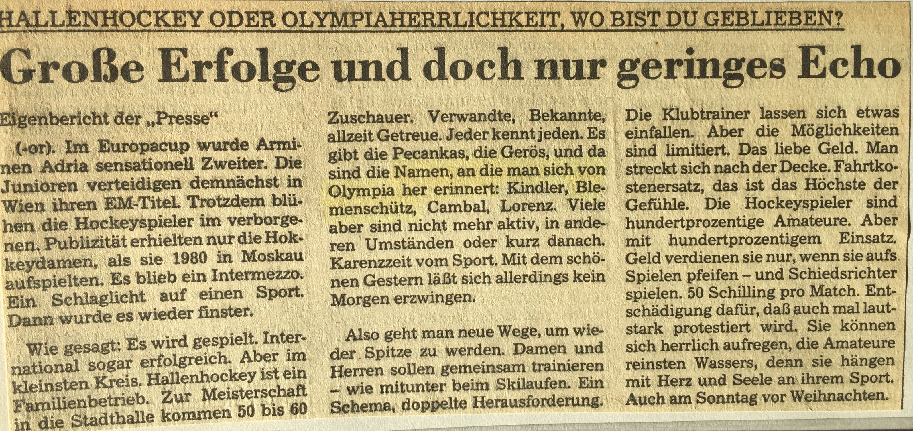 Leider ziehen sich die doch eher bescheidenen internationalen Erfolge am Feld wie ein roter Faden durch die österreichische Hockeygeschichte. Die im internationalen Vergleich doch sehr geringe Dichte an Hockeyspielern wirkt sich einerseits negativ auf die Leistungsdichte eines breiten Kaders aus (immerhin benötigt man am Feld bis zu 18 Spieler, die stocktechnisch und athletisch mithalten können sollten - in der Halle sind es nur 12) und anderseits auf das Niveau in der österreichischen Meisterschaft. Damals wie heute: Spieler opfern ihre Freizeit, stellen Studium und Beruf hintan und zahlen Selbstbehalte für Turniere und Reisen. Viel Idealismus, der in der österreichsichen Hockeyfamilie vorhanden sein muss!