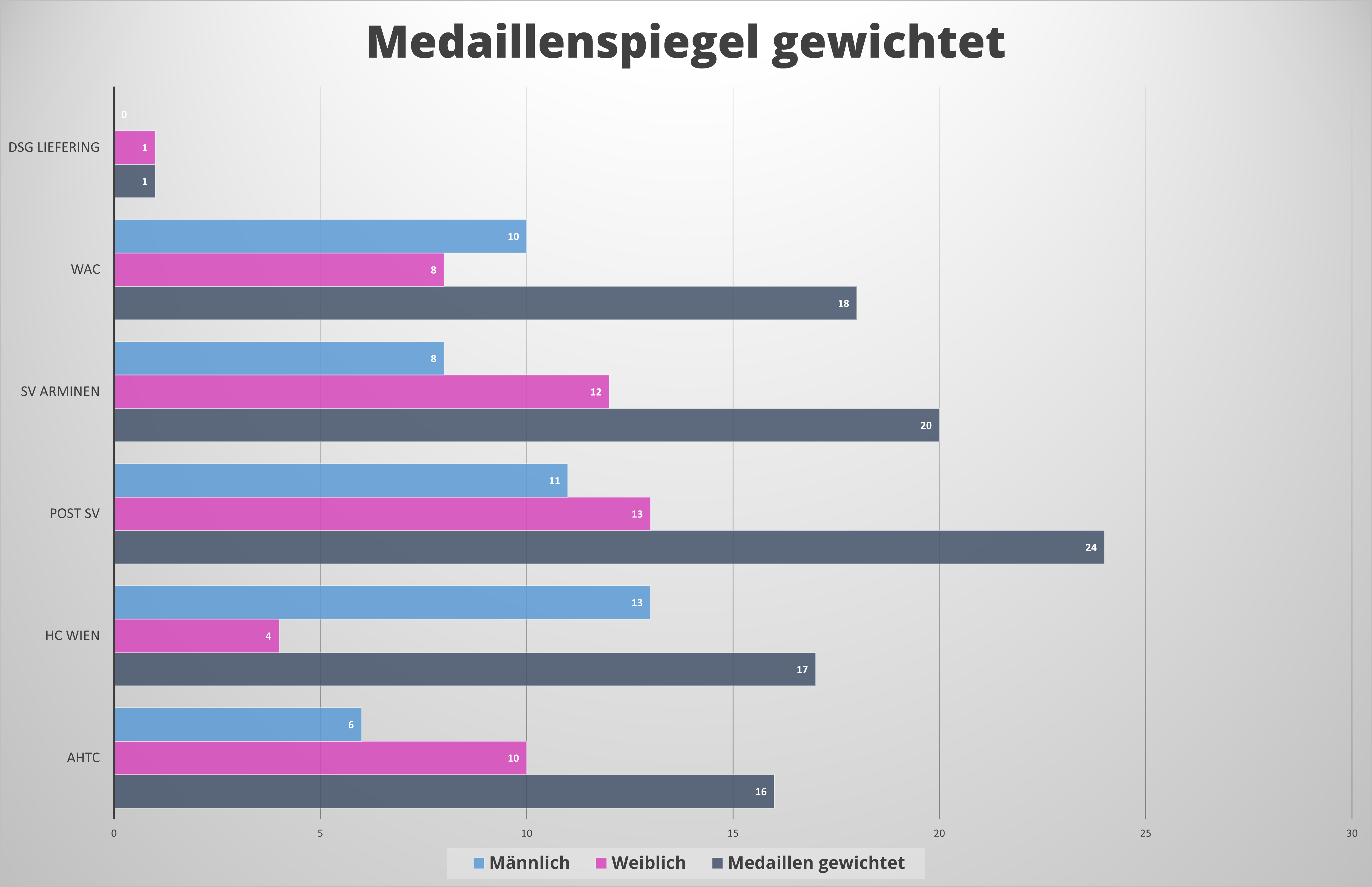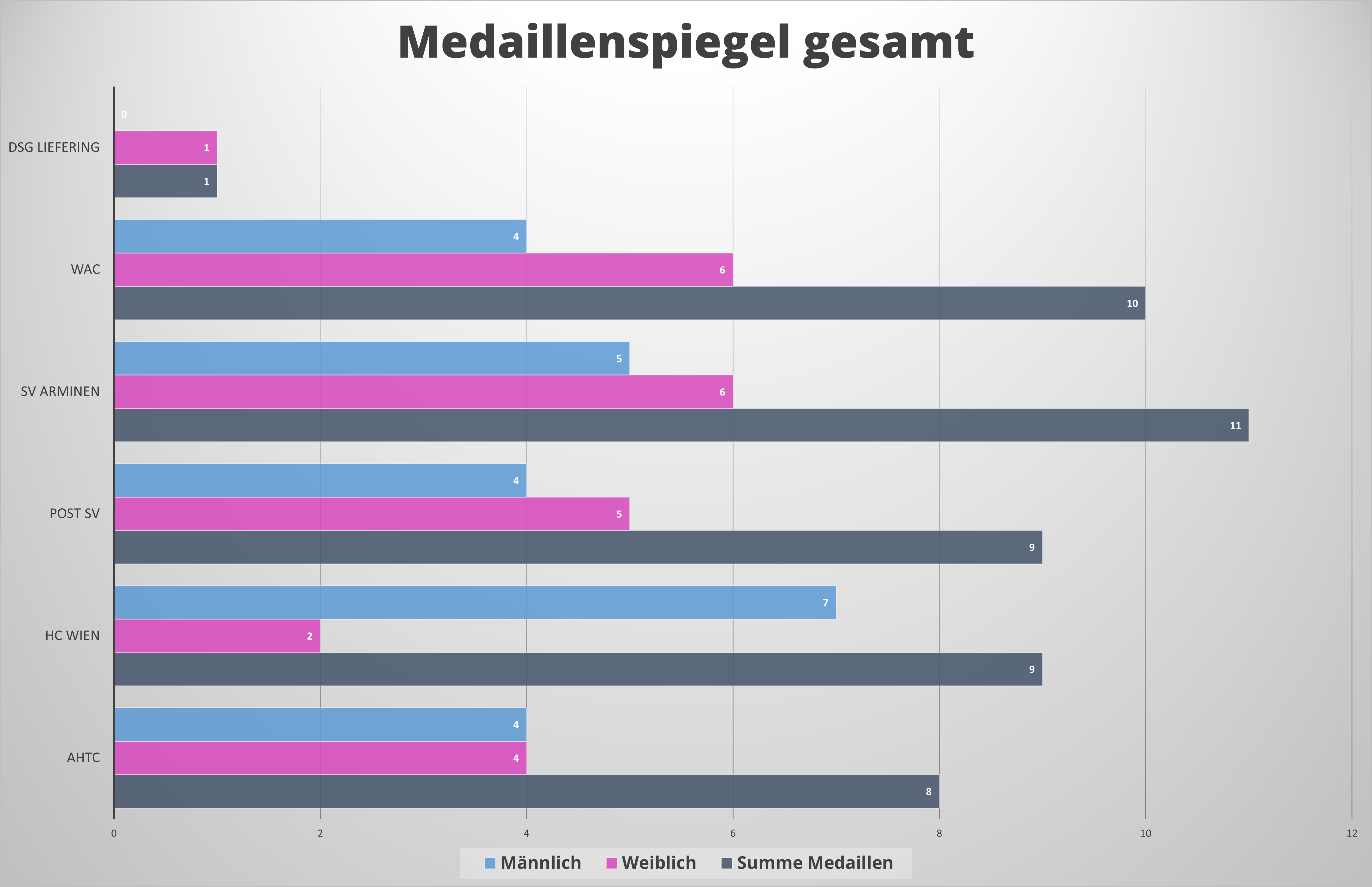Dahinter liegen dicht gedrängt der WAC mit 10 Medaillen, Post SV und HC Wien mit je 9 und AHTC mit 8 Medaillenplätzen.
