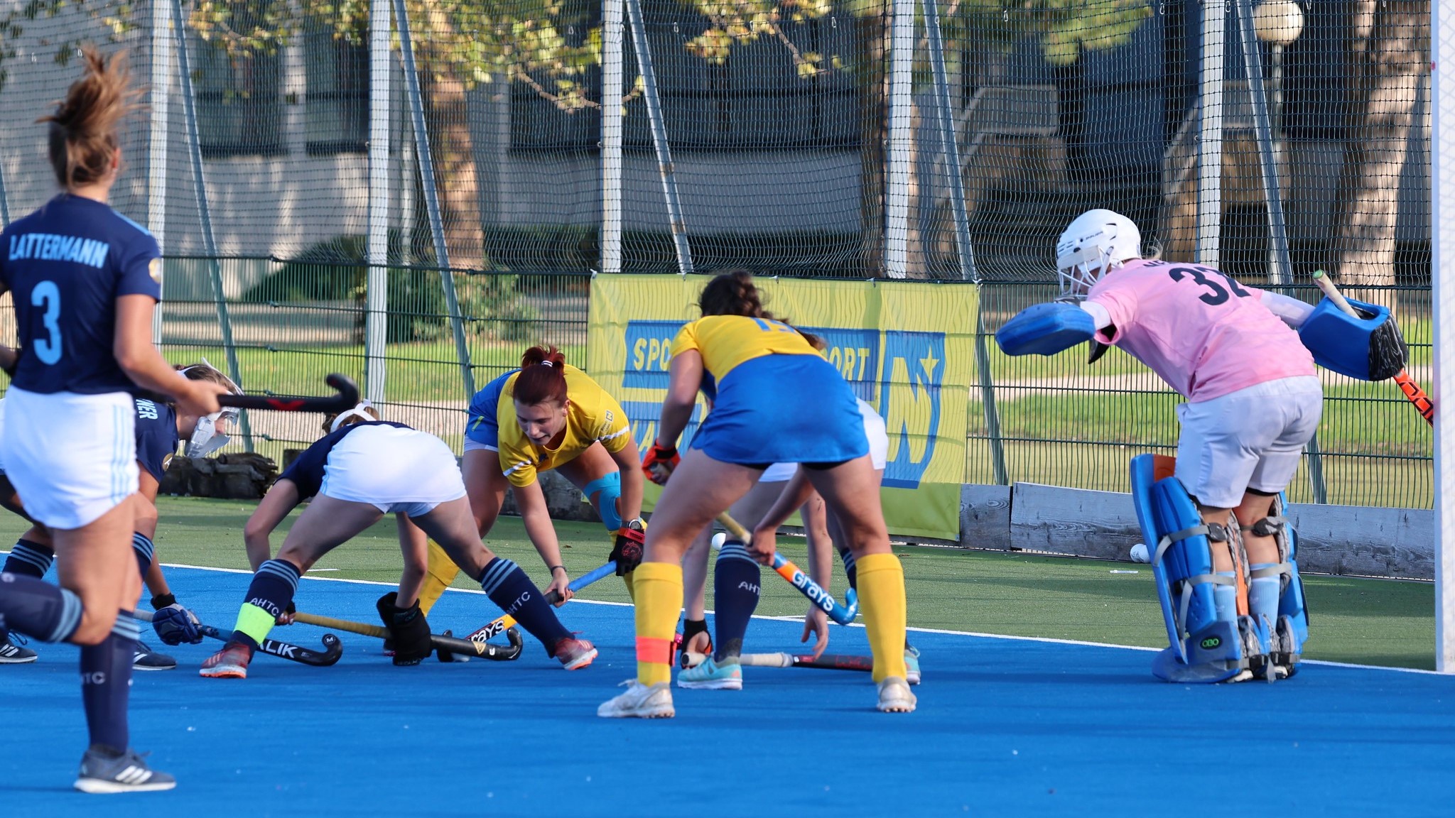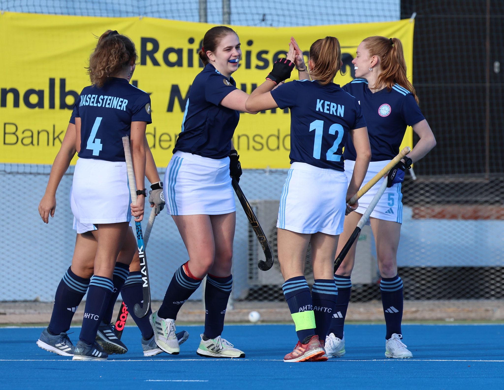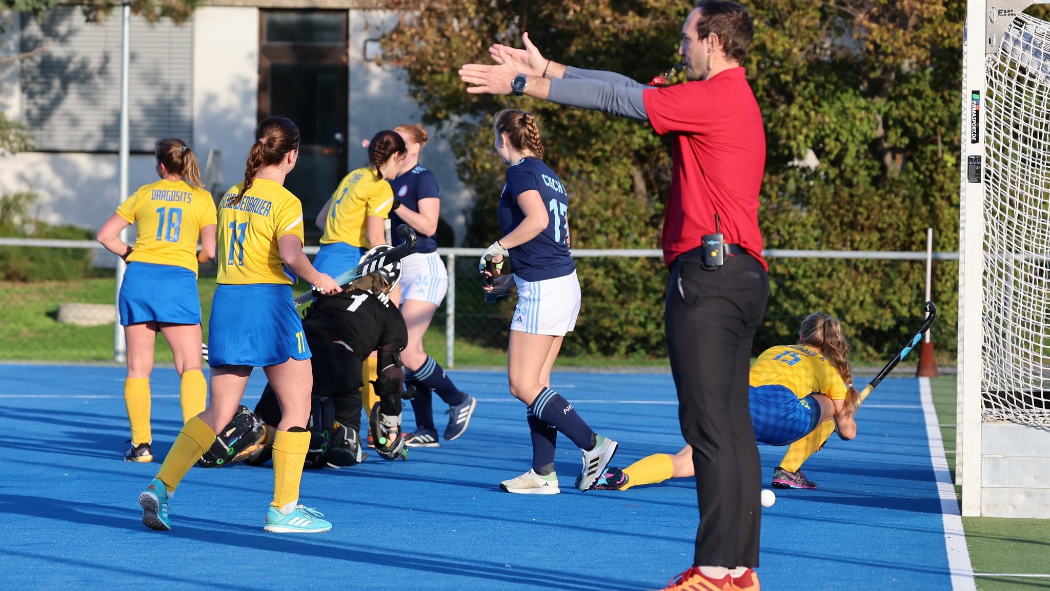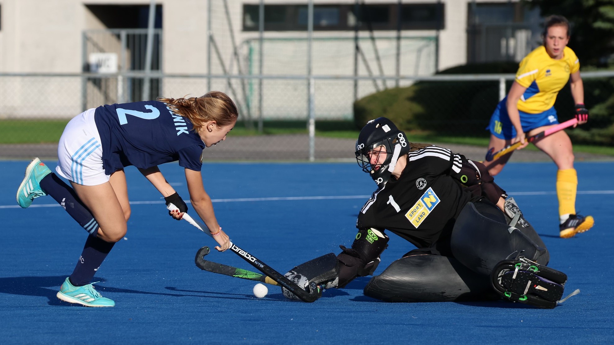 Plötzlich liegt beinahe der Ausgleich in der Luft: Neudorf vergibt eine Strafecke und einmal ist Marianne Pultar schon an der Torfrau vorbei, doch der Ball kann noch von einer AHTC-Verteidigerin von der Linie gekratzt werden.