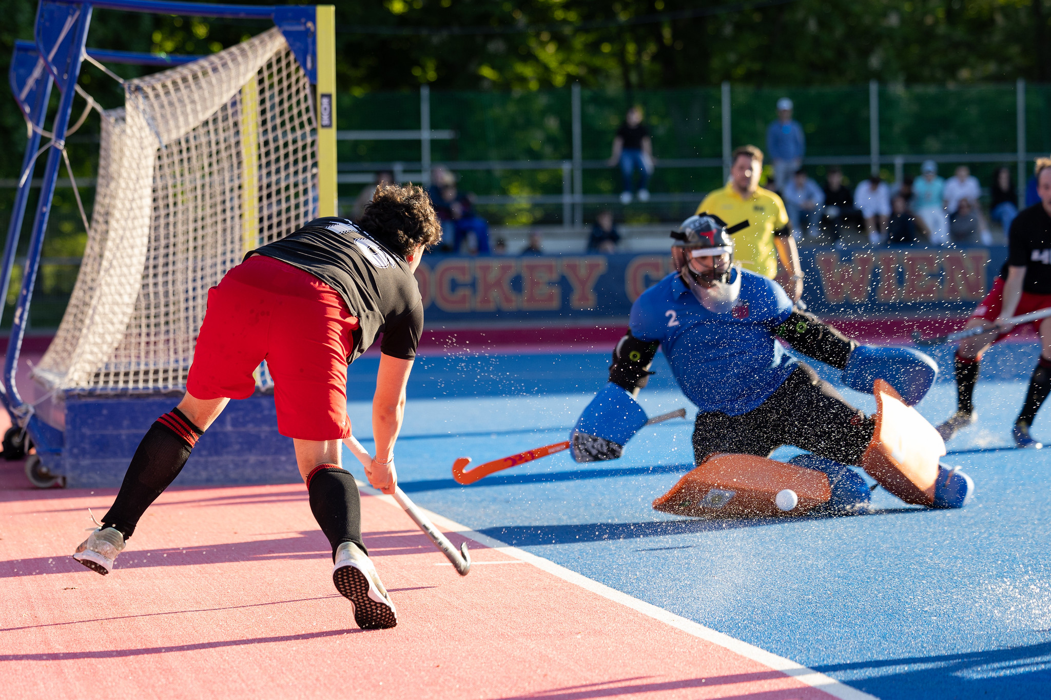 Wechselnde Szenen und Chancen auf beiden Seiten sehen alle Fans im Hockeystadion. Paul Drusany holt mit einer schönen Einzelaktion im ersten Viertel einen 7m für Post SV. Diese Chance lässt sich Peter Kaltenböck nicht entgehen und bringt seine Mannschaft 1:0 in Führung.
