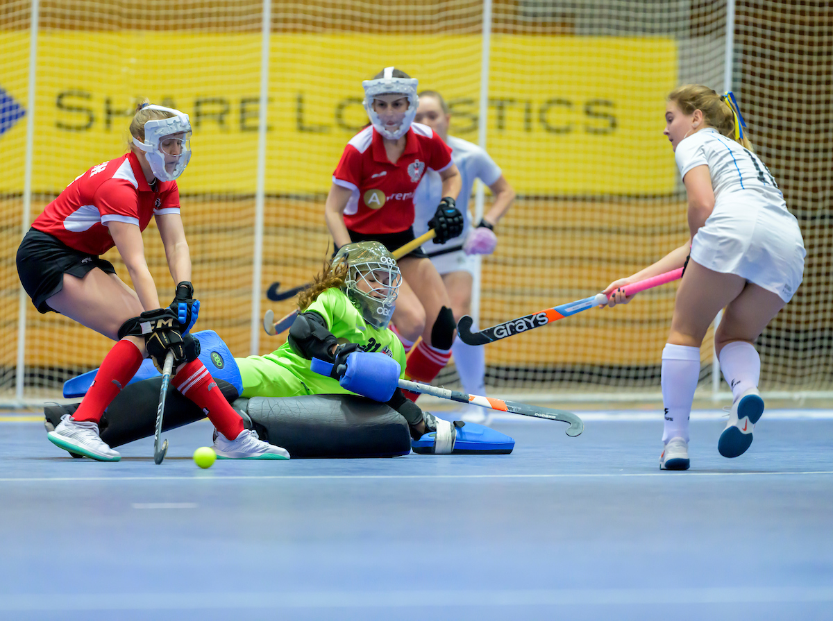 Torfrau Stella van Rahden sehr aufmerksam bei zwei Angriffen der Ukraine. Fiona Felber schiebt kurz vor Ende des ersten Viertels den Ball Richtung ukrainisches Tor - der stellt ab keine Gefahr dar.