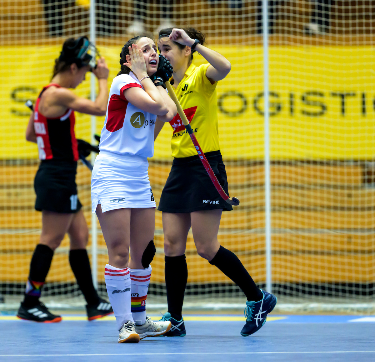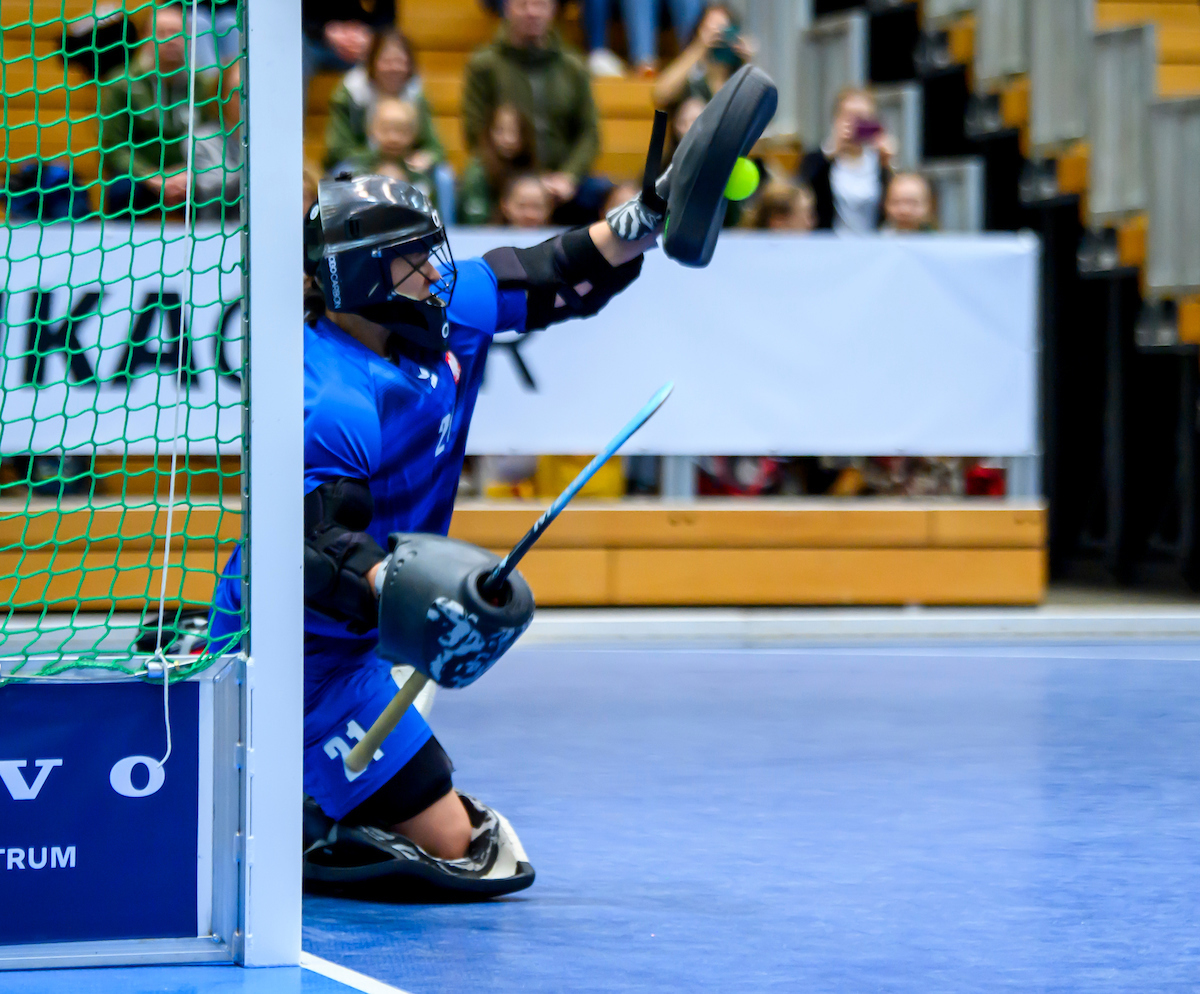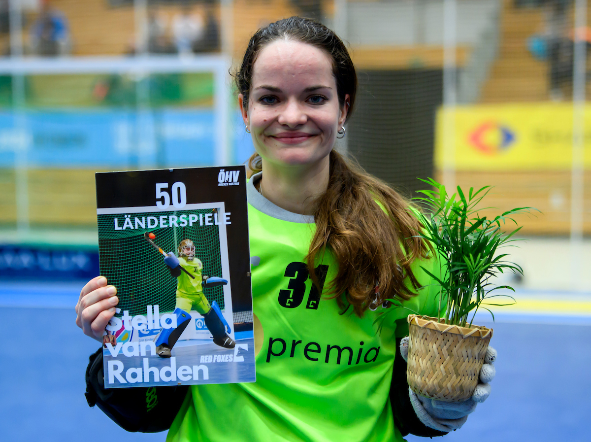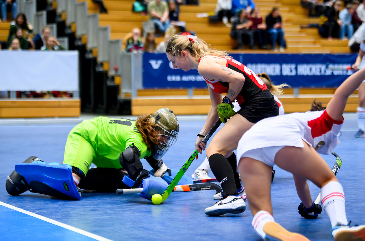 Extremes Missverständnis in der österreichischen Abwehr: Johanna Czech wird am Schusskreisrand bedrängt, die gegnerische Spielerin hält ihren Schläger dazwischen und der Ball wird Richtung Tor abgelenkt. Stella van Rahden übersieht, dass der Schläger den Ball innerhalb berührt und lässt den Ball passieren. Leider Tor! Ein extrem kurioser Ausgleich.