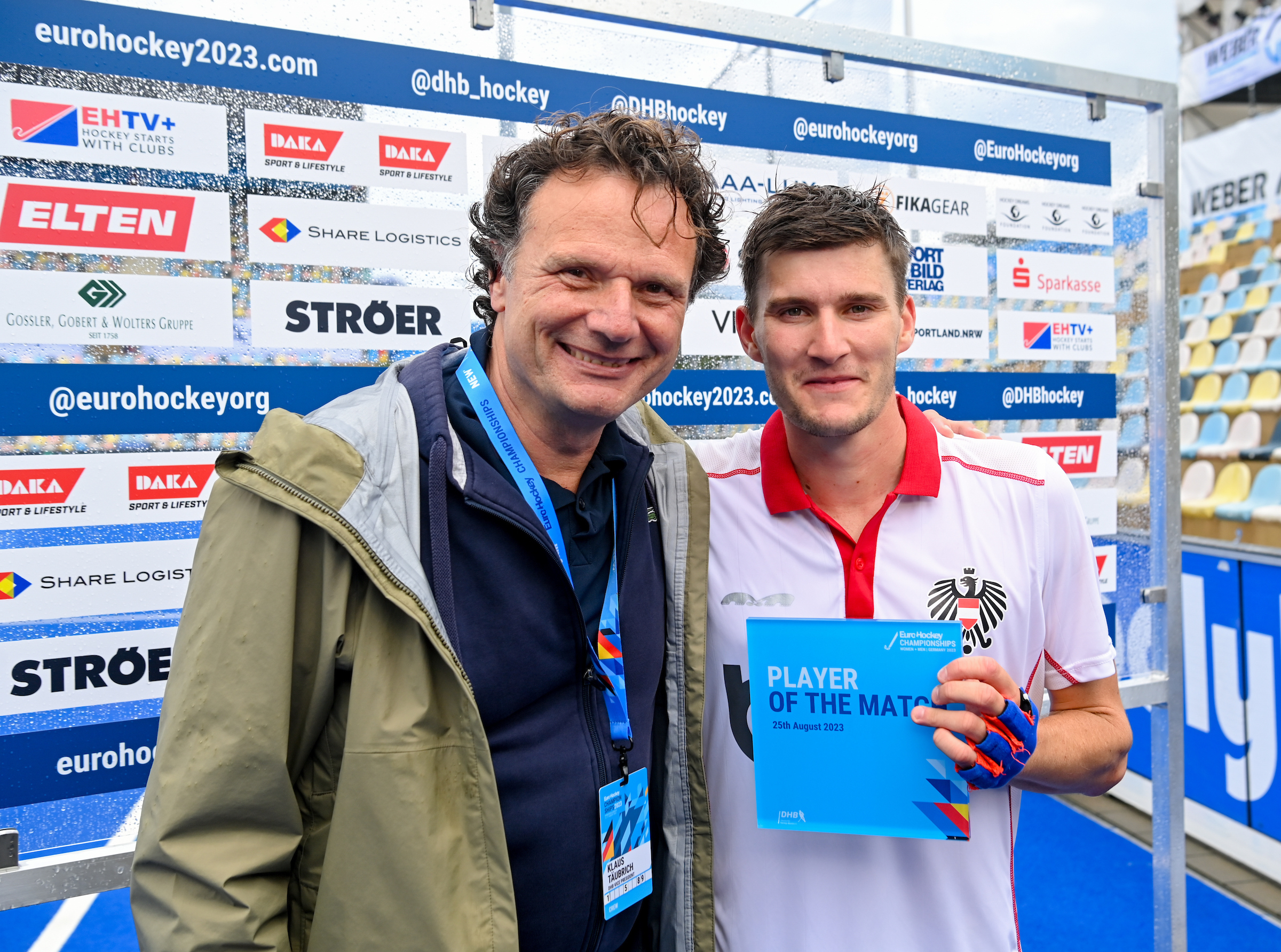 Das Spiel wogt hin und her. Fabian Unterkircher kommt gut durch und erzwingt einen Freischlag an der gegnerischen Viertellinie. Guter Pass in den Kreis und Josef Winkler hämmert den Ball mit der Rückhand unter die Latte. 2:1 für Österreich im Minute 22.