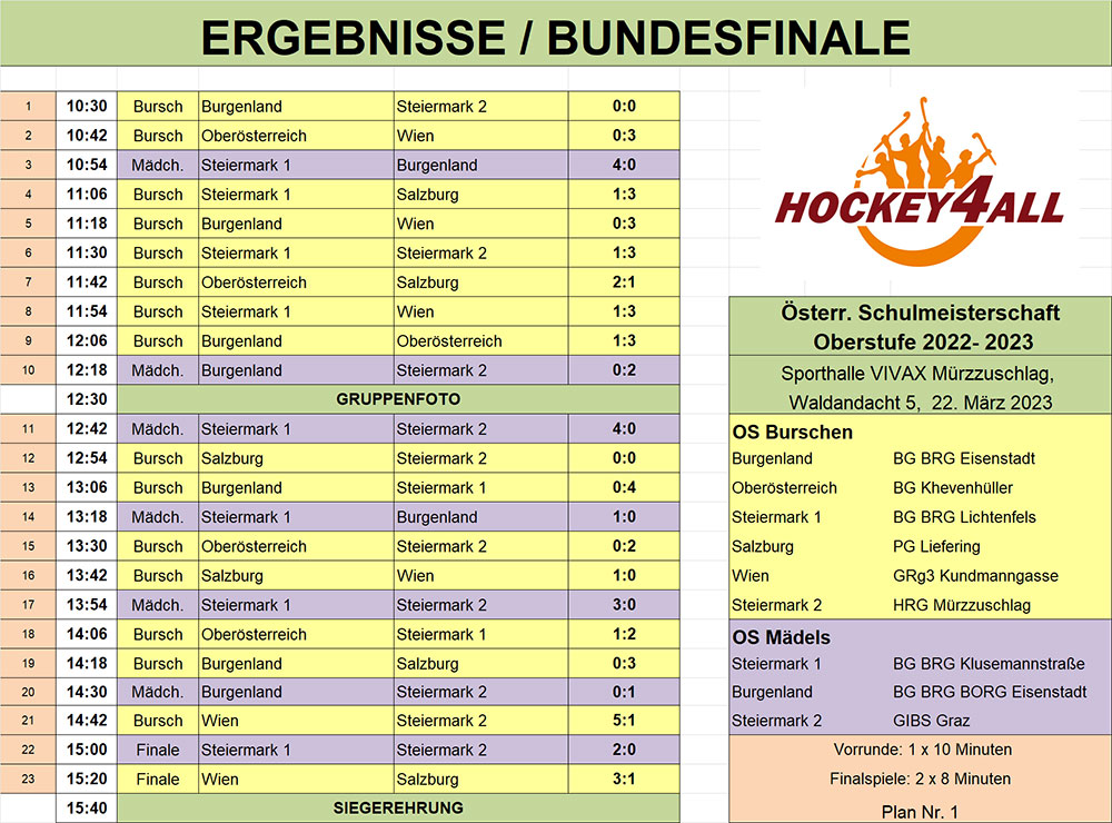 Die Siegerehrung wurde vom Mürzzuschlager Sportreferenten Horst Pimeshofer und Peter Reithofer vom HRG Mürzzuschlag durchgeführt. Der Bundesreferent Wolfgang Sternberger wertete die Veranstaltung durch seine Anwesenheit zusätzlich auf. Ein herzliches Dankeschön an alle Helfer und das Schiedsrichterteam. Viele lachende Gesichter und viel Emotion bei und zwischen den Spielen trugen zu einer sehr gelungenen Schlussveranstaltung im Schulhockeyjahr bei.