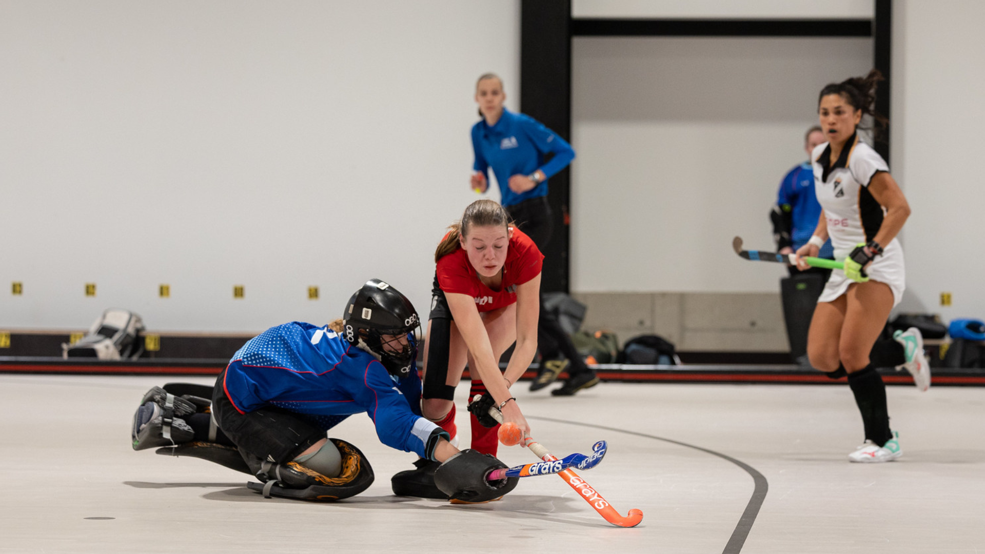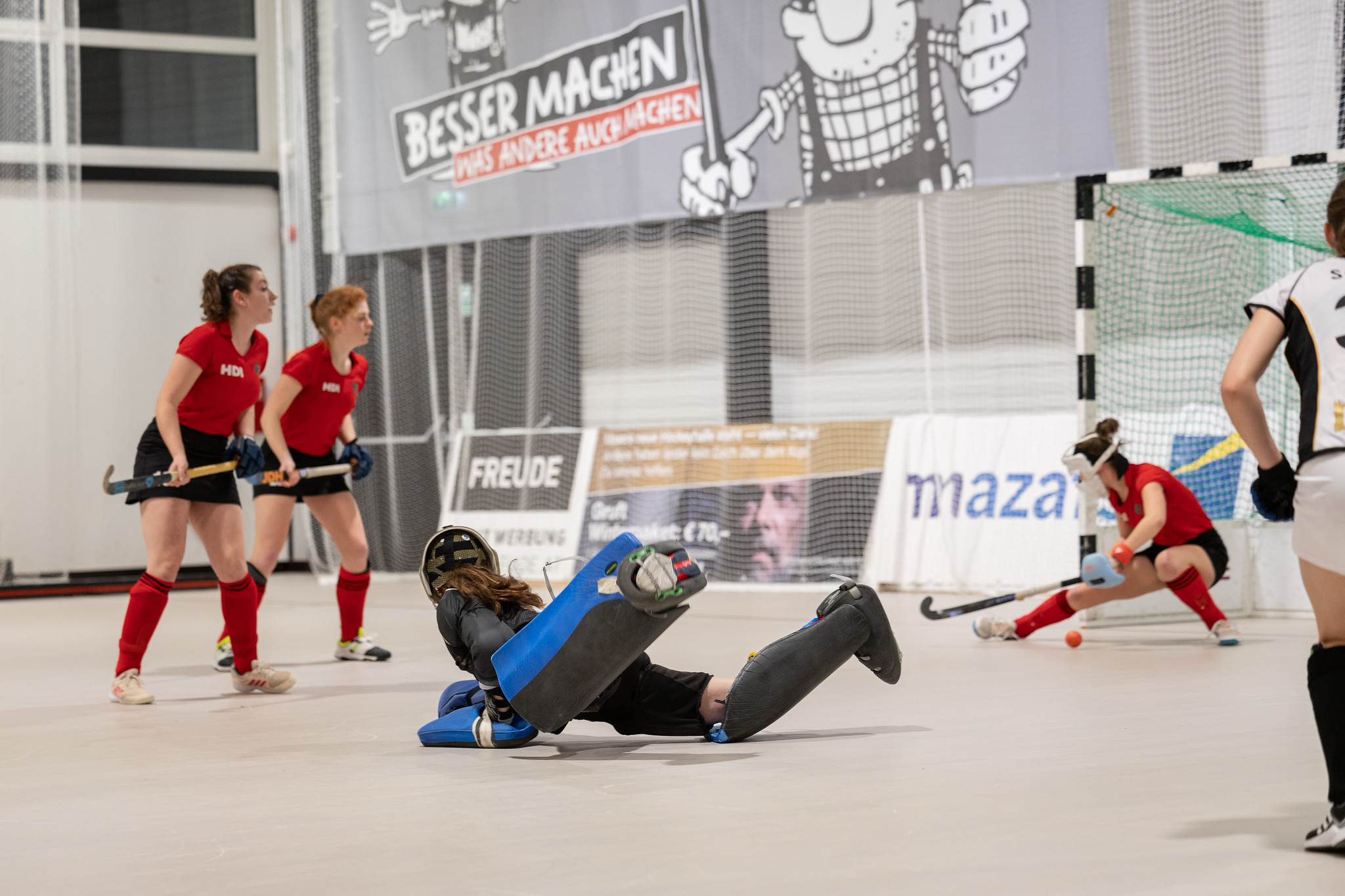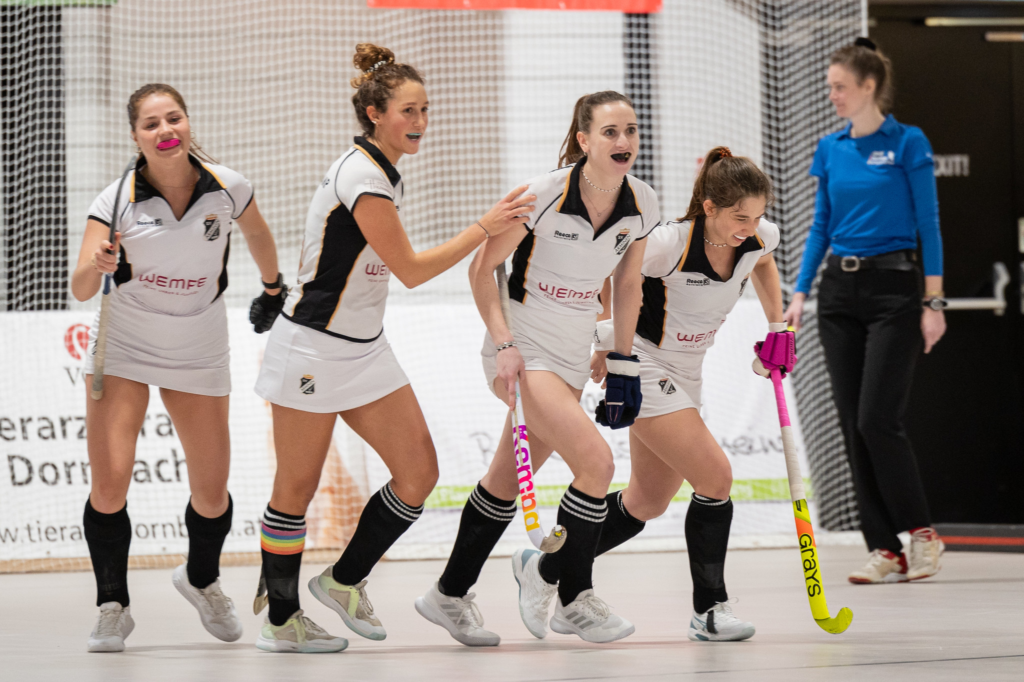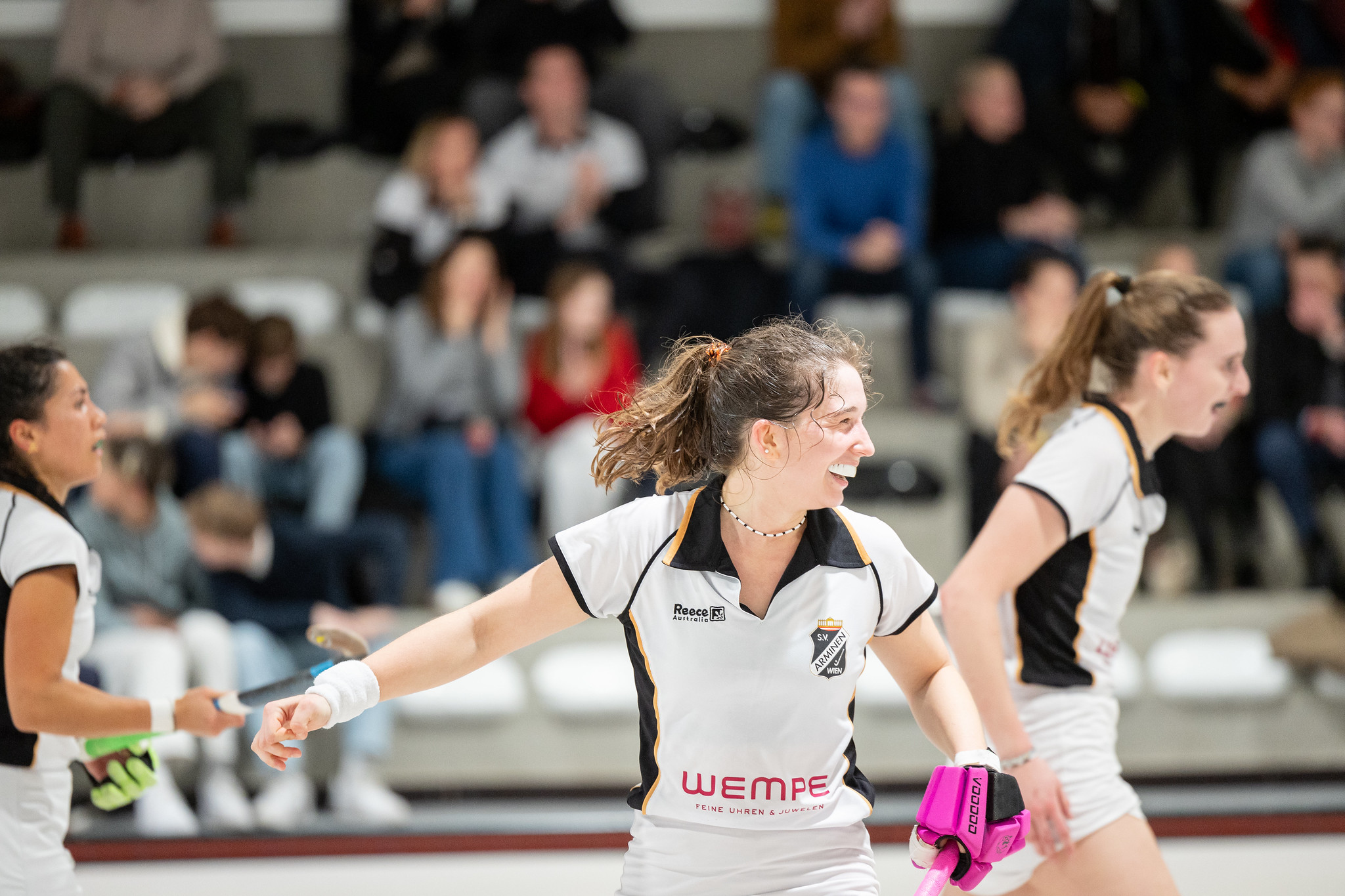 Weiter geht's - beide Mannschaften suchen aktiv das Spiel nach vorne und attackieren früh. Schneller Konterangriff über Maxine Collien und Strafecke für SV Arminen. Der Ball ist zwar im Tor, springt aber bei der Stoppaktion hoch - kein Tor!