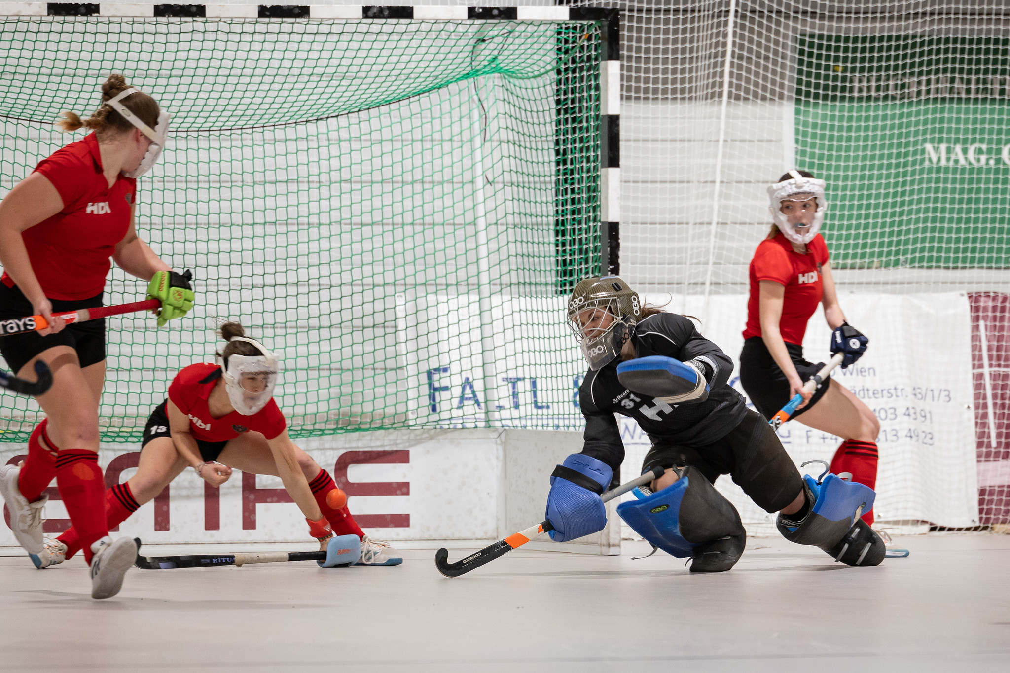 In Folge wogt das Spiel hin und her - Unterzahl auf beiden Seiten, die keinen Vorteil bringen. Kaum vollzählig trifft Maxine Collien die Innenstange und von dort geht der Ball in das Tor. 4:3 für SV Arminen. Strafecke für HDI-WAC in der 46. Minute, Wiederholungsecke, abgewehrt.
