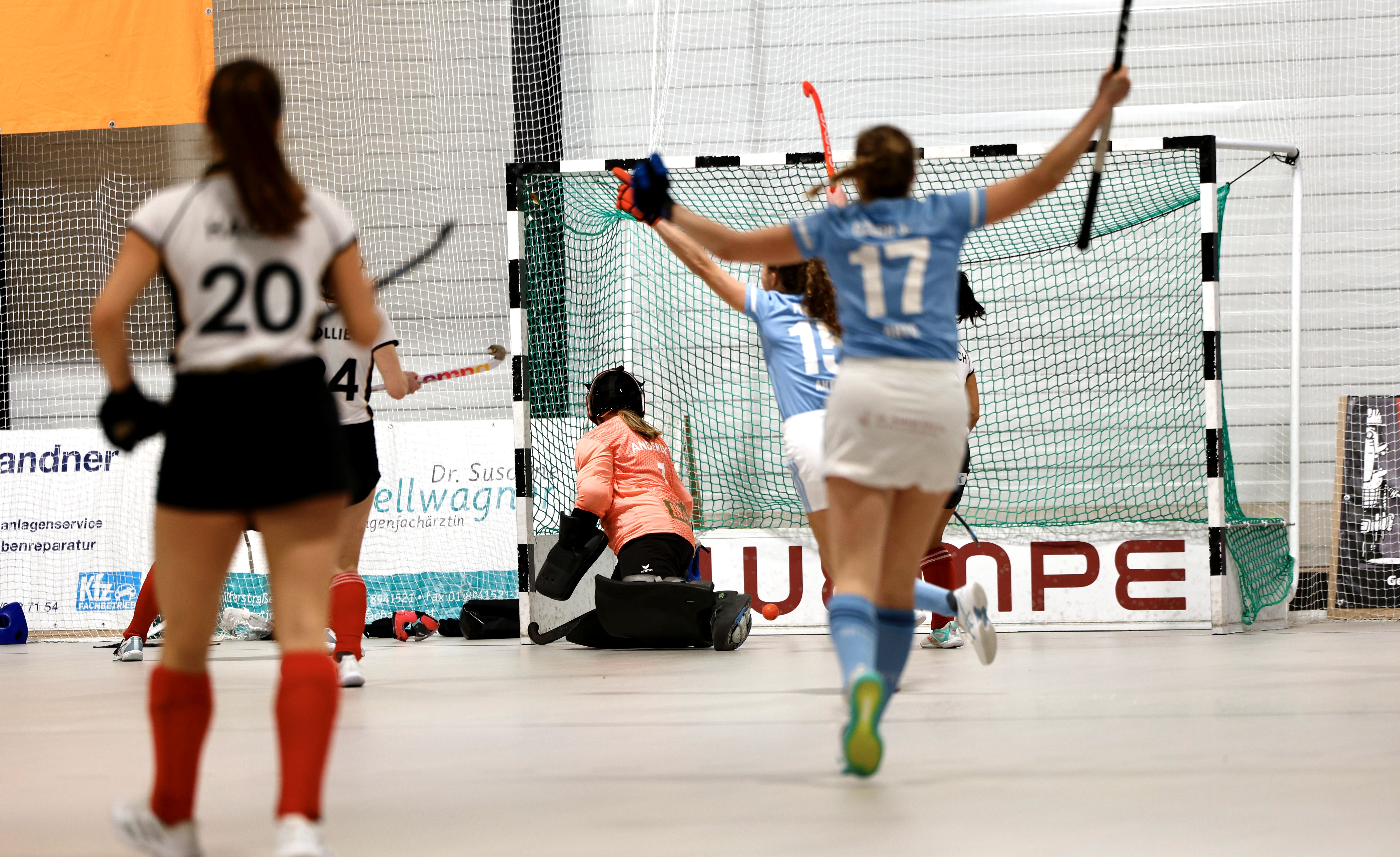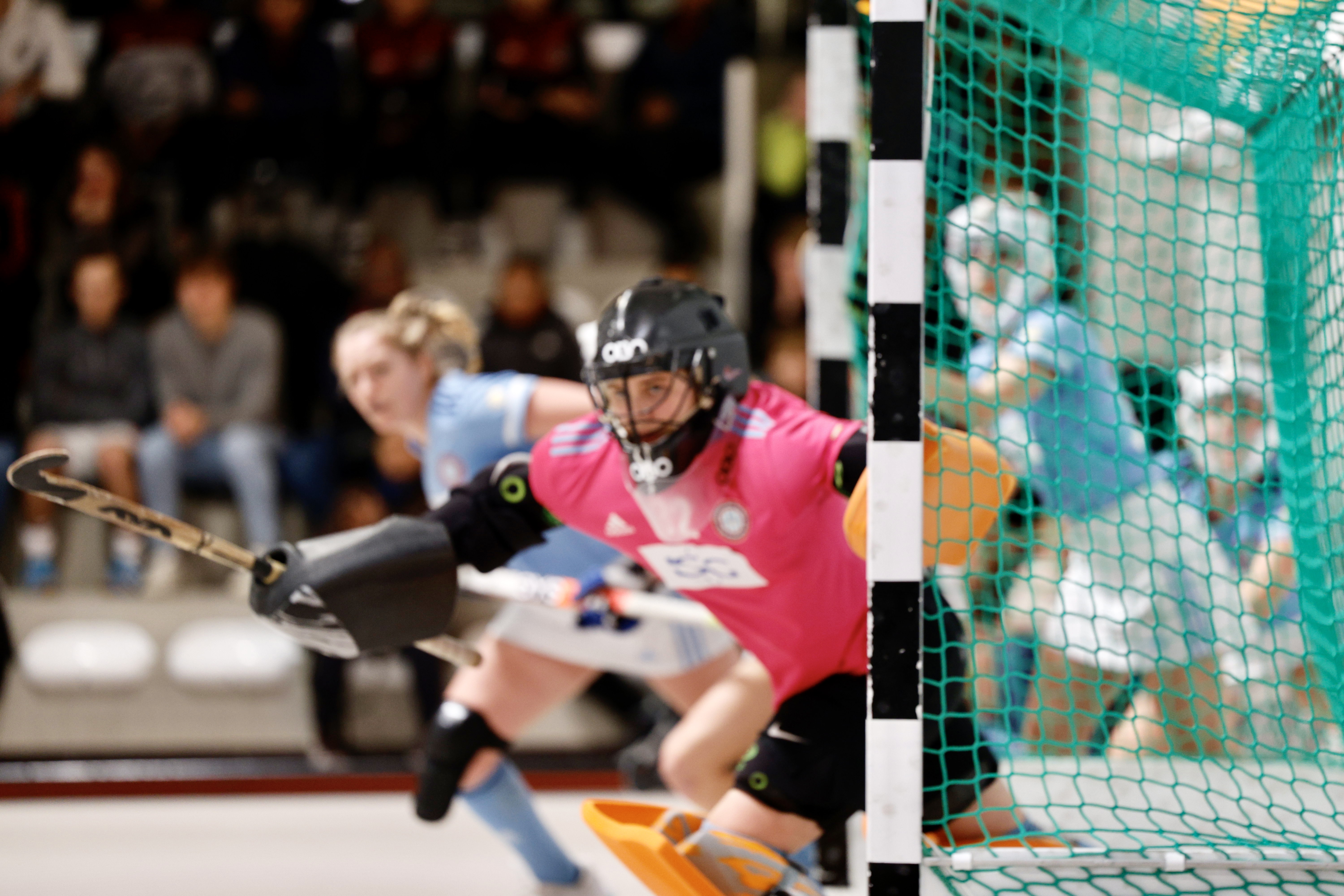 Konterangriff über Maxine Collien, aber Golie Fabian Gnehm klärt im Herausrutschen. Es folgt die erste Strafecke für SV Arminen in der 7. Minute, aber auch diesen Ball kann die AHTC-Torfrau abwehren.