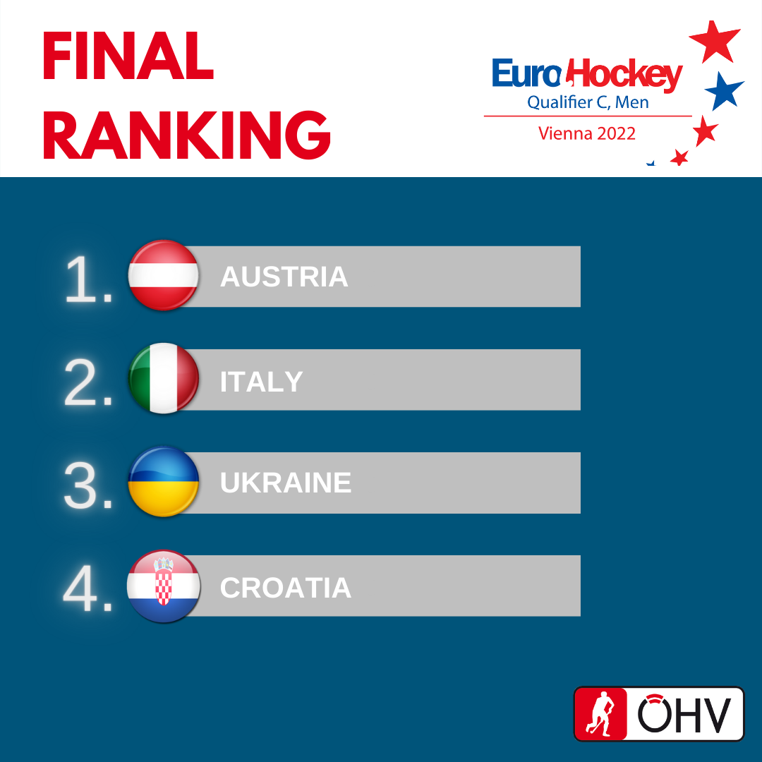 Spannend verläuft die 2. Halbzeit und vor allem das letzte Viertel, denn bis dahin bleibt es beim 1:1. In der 52. Minute legt Italien wieder vor - 2:1 per Strafecke. 3 Minuten später 7m-Alarm und daraus folgt der Ausgleich zum 2:2. Italien setzt nun alles auf eine Karte und nimmt den Tormann zugunsten eines zusätzlichen Feldspielers vom Platz. Ein Abwehrfehler der italienischen Verteidigung ermöglicht der Ukraine ein empty goal zum 3:2. Nur mehr 3 Minuten auf der Uhr und Italien gibt nicht auf. In der 60. Minute verwandeln sie neuerlich eine Strafecke zum 3:3. Und während die österreichischen Fans schon beinahe den sicheren Turniersieg feiern gehen wollen, wird mit dem Schlusspfiff abermals eine Strafecke für Italien verhängt. Körperabwehr eines ukrainischen Spielers auf der Linie und der dafür verhängte 7m kann KEENAN Thomas in einen 4:3-Sieg für Italien verwandeln.