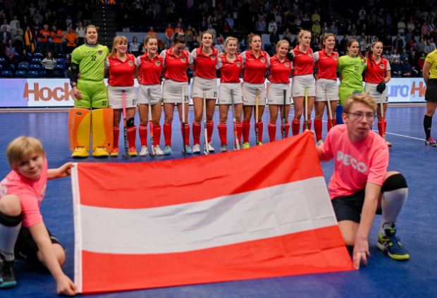 Chancen auf beiden Seiten zu Beginn des Spiels, aber kleine technische Fehler verhindern eine größere Gefahr. Luisa Mayer schießt von rechts auf das Tor - Unsicherheit bei der Torfrau und Strafecke für Österreich. Der Schuss von Daria Buchta wird abgewehrt. Dann dribbelt sich Marianne Pultar links durch, kommt aber nicht zum Torschuss.