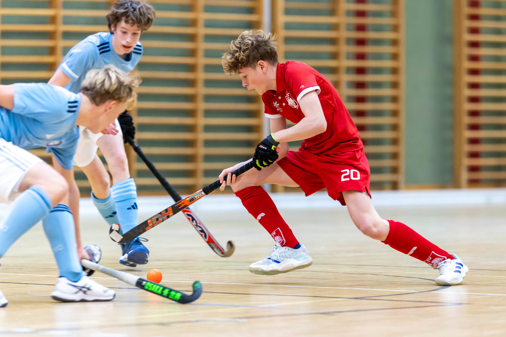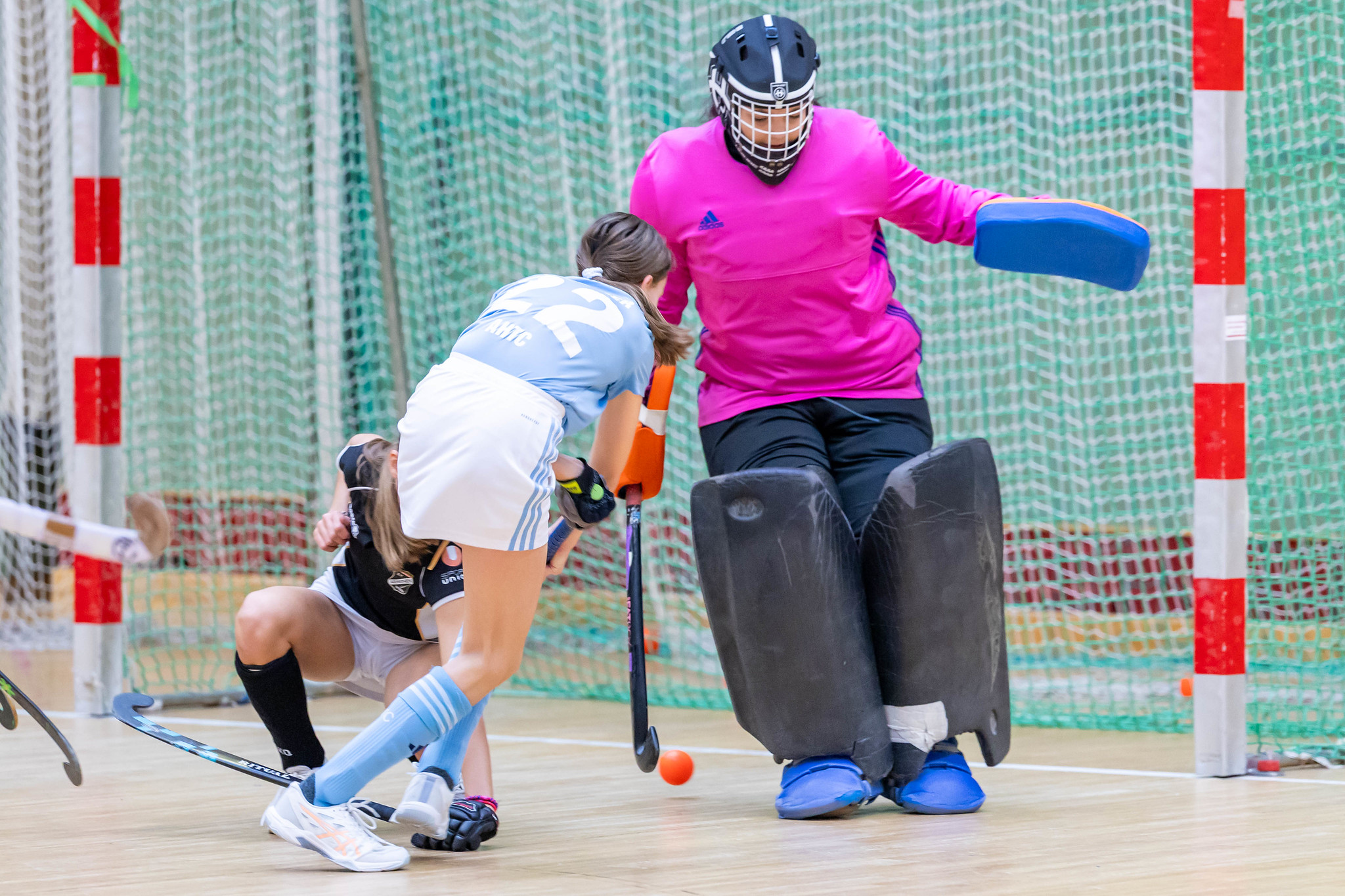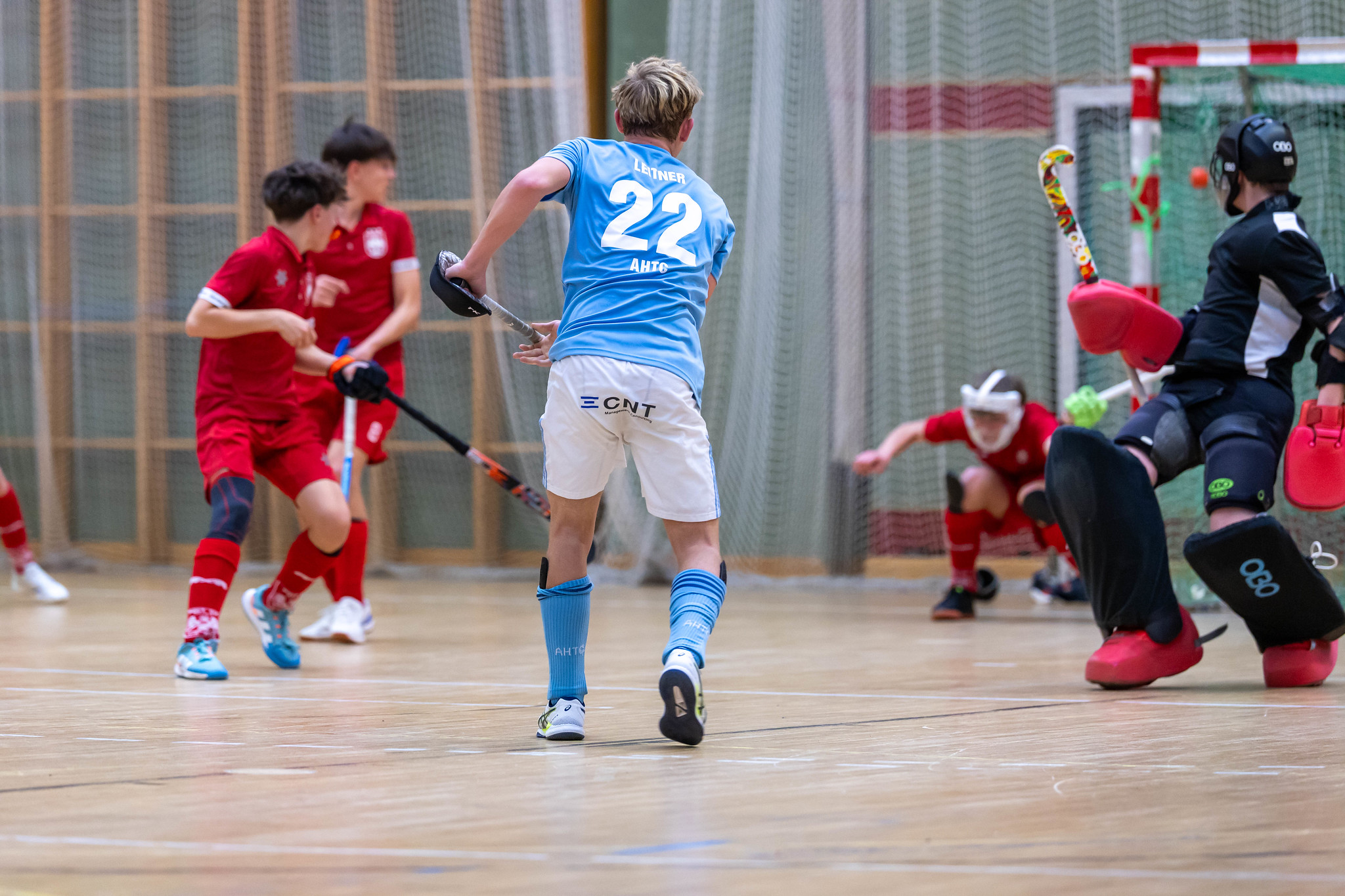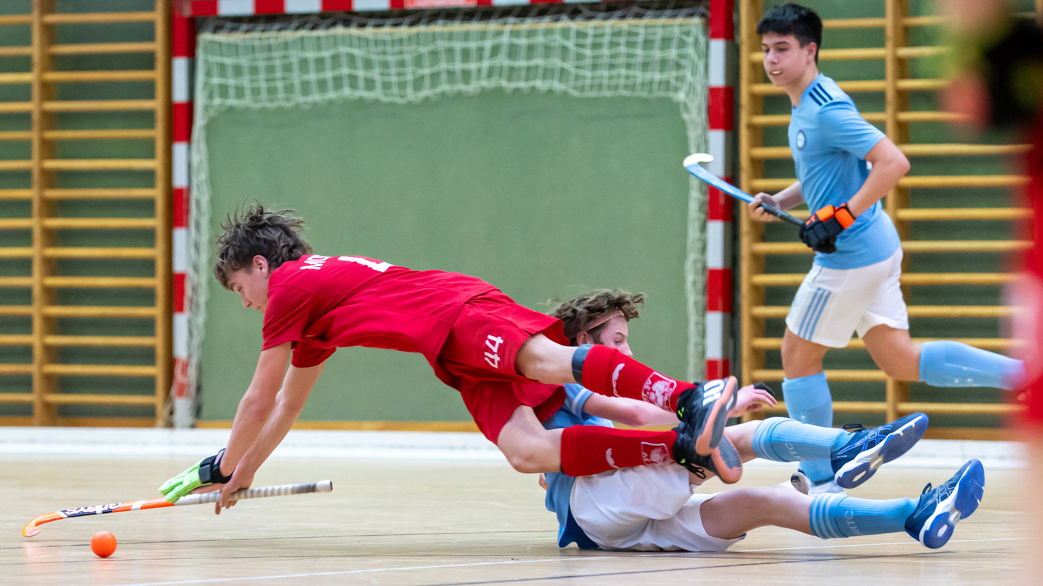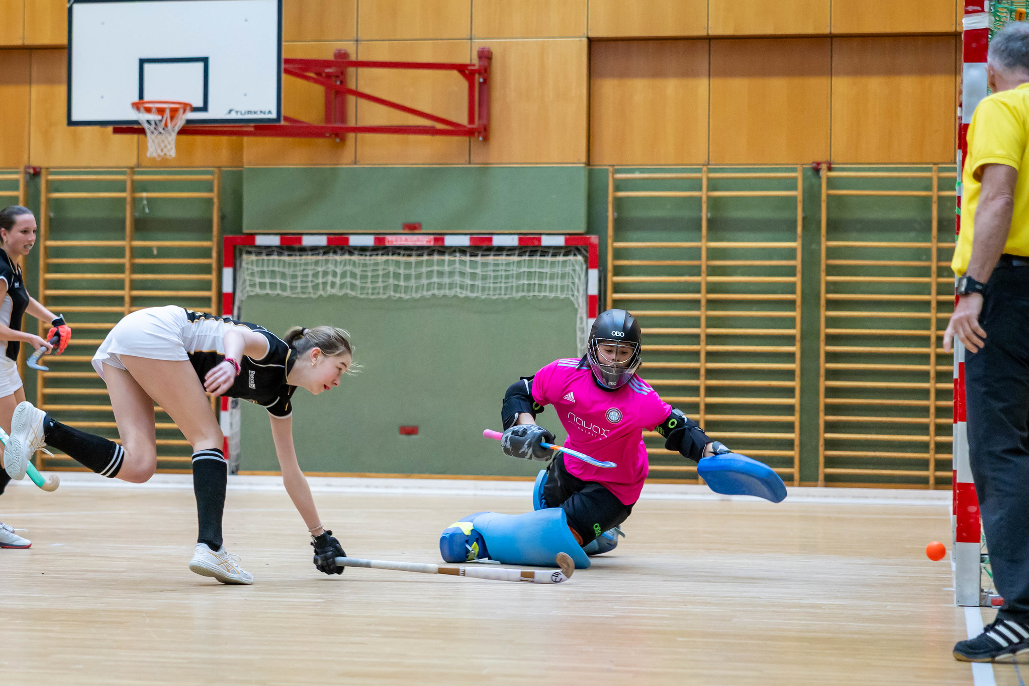 Ein sehr intensives Spiel sehen die Zuschaer in der DON-Halle - flott und kampfbetont geht es hin und her. David Apflauer hat in der 13. Minute das Glück des Tüchtigen - er streckt sich lang, berührt mit der Spitze des Hockeyschlägers gerade noch den Ball - die Berührung reicht und der Ball ist im Tor. 3:1 für Post SV.