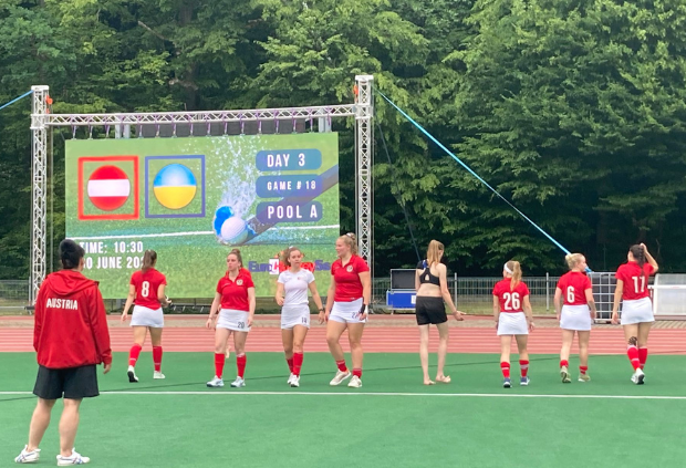 Start in das letzte Gruppenspiel. Mit einen "Rückhandhammer" lässt Isabella Klausbruckner der Torfrau keine Chance und Österreich geht in der 3. Minute in Führung. 2 Minuten später lässt die Ukraine die Chance einer Challenge aus, kann aber in der 7. Minute ausgleichen.