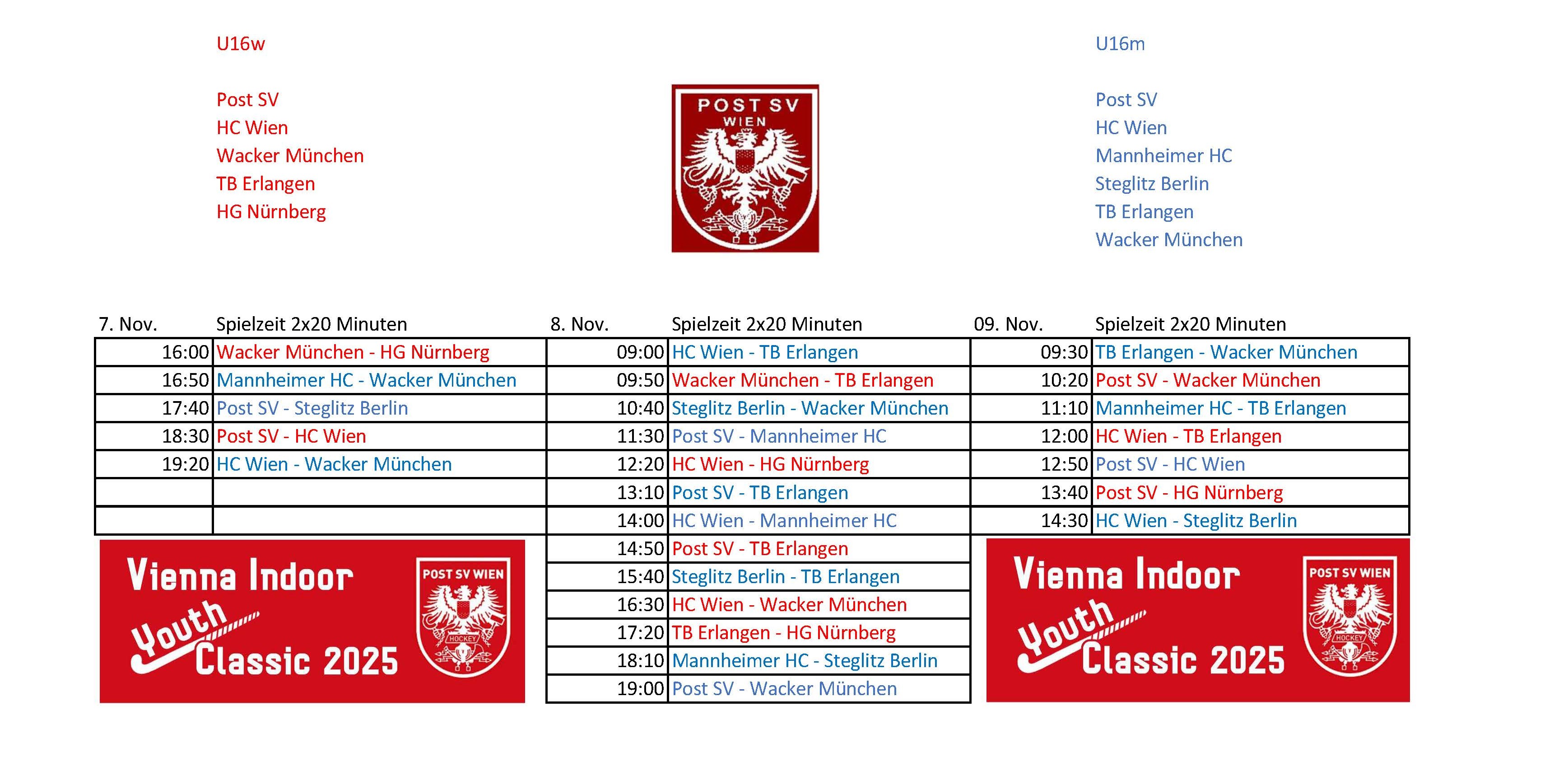 Kommendes Wochenende wird in der Posthalle wieder Jugendhockey vom Feinsten gezeigt. Der Einladung der beiden U16 Feld-Titelträger vom Post SV sind gleich 9 Teams aus Österreich und Deutschland gefolgt.