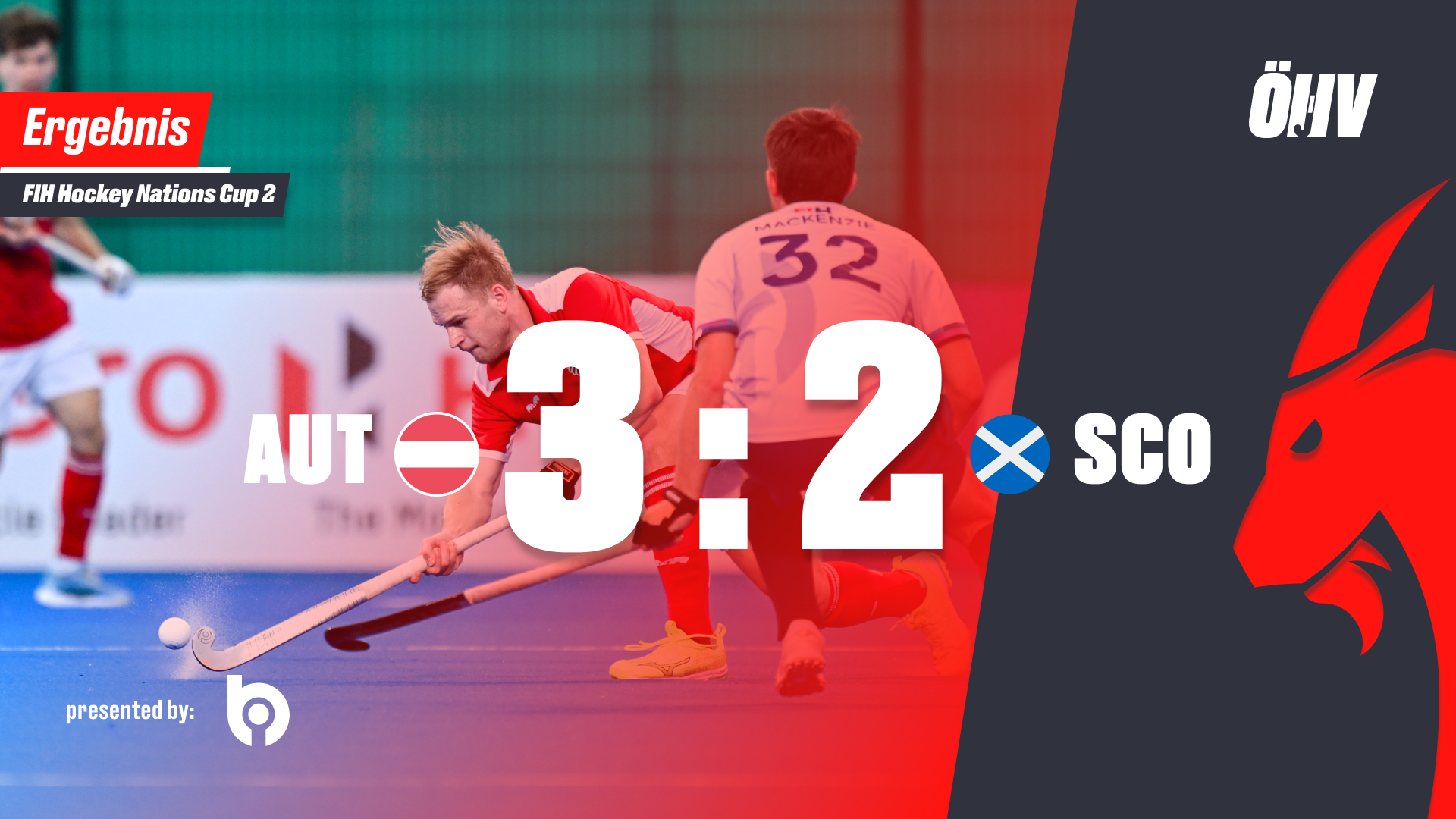 Struan Walker tanzt durch die Verteidigung der Österreicher und holt die Strafecke für Schottland, aber Österreich kann die Situation entschärfen. Und dann führt ein starker Antritt von Fülöp Losonci mit einem unhaltbaren Rückhandschuss zur 3:1-Führung für Österreich (57').