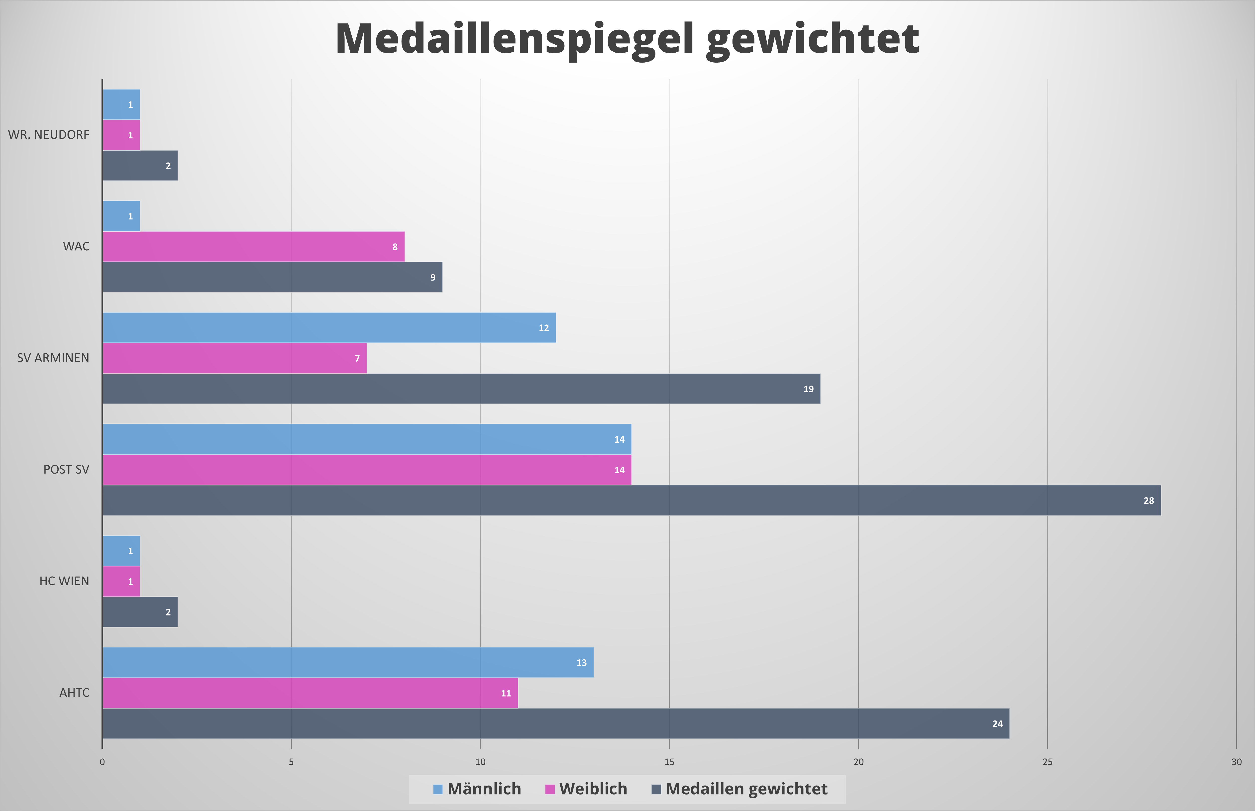 Gewichtet man alle errungenen Medaillen (3 Punkte für Gold, 2 Punkte für Silber und 1 Punkt für Bronze), dann liegt auch da der Post SV mit 28 Punkten an der Spitze. Sie verteilen dabei ihre Punkte gerecht auf den weiblichen und den männlichen Bereich mit je 14 Punkten.