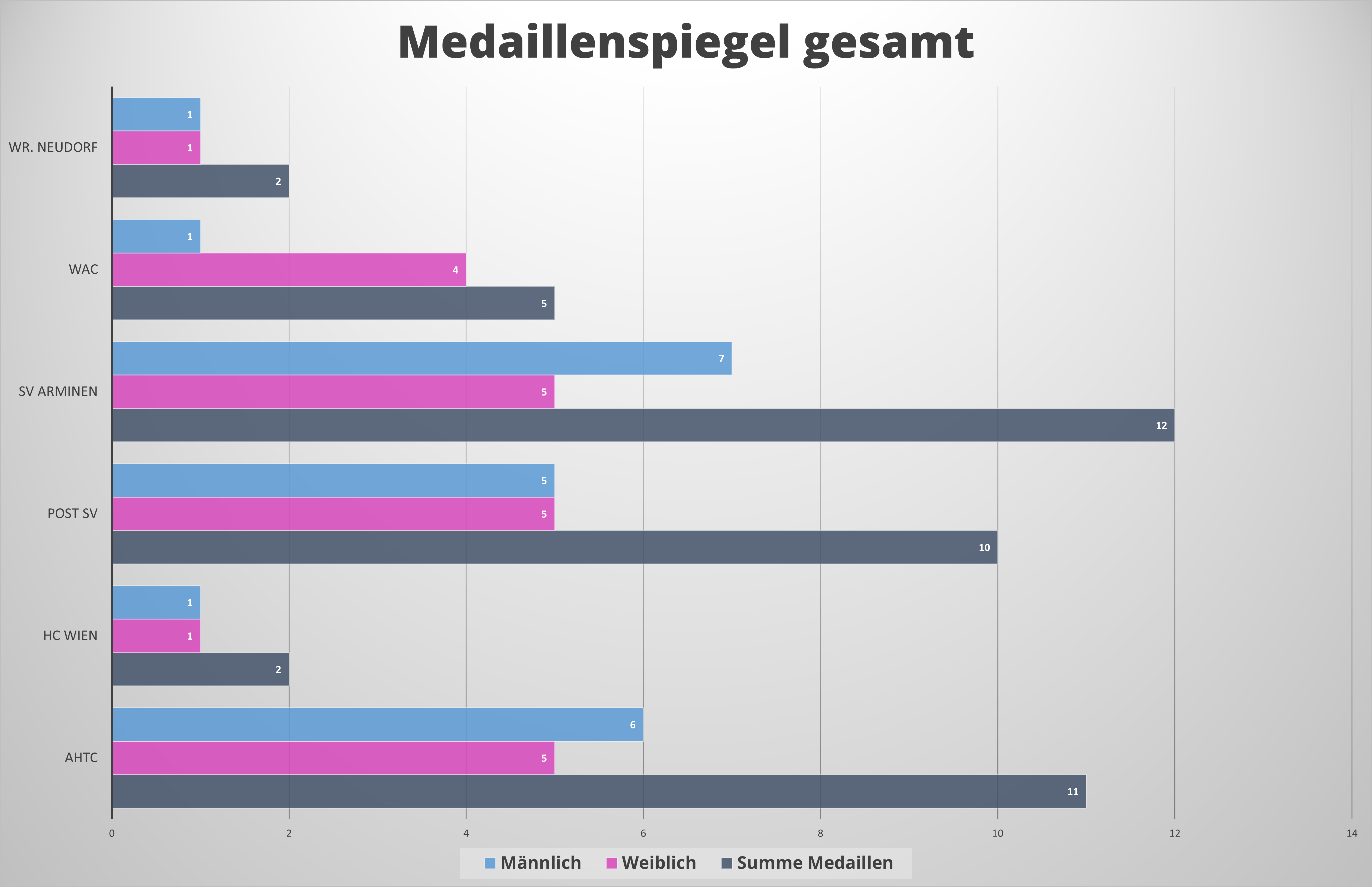AHTC liegt auch in der Gesamtwertung der gewichteten Medaillenränge auf Platz 2 mit 24 Punkten. Im männlichen Bereich liegen sie mit 13 Punkten gerade einmal mit einem Punkt hinter Post SV. Auch im weiblichen Bereich halten sie Platz 2 mit 11 Punkten.