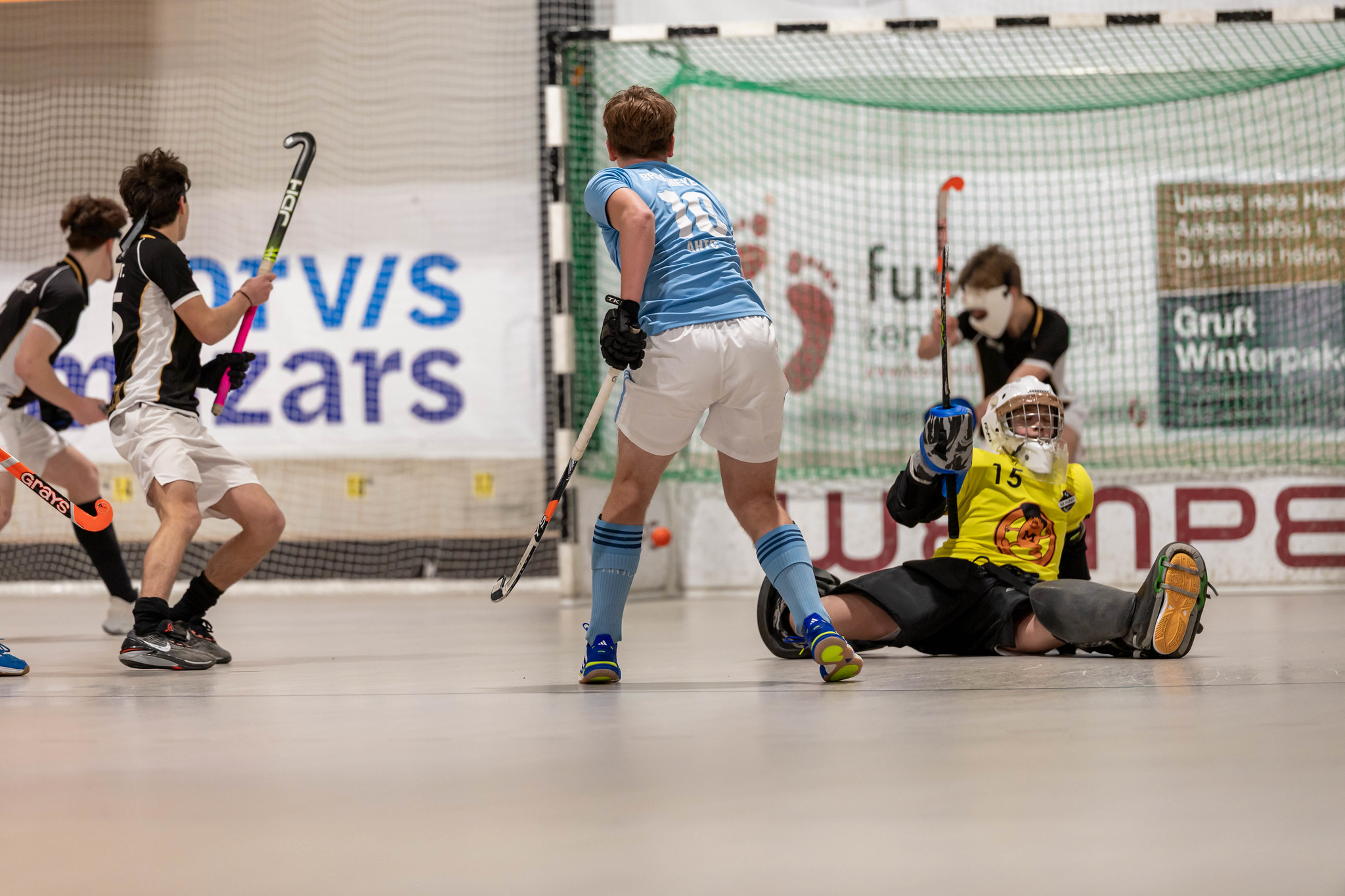 Hand oder Fuß - ist zwar nicht das gleiche Körperteil - aber jedenfalls gibt es Strafecke gegen SV Arminen. Diese wird entschärft und es bleibt zur Halbzeit beim 4:3 für AHTC.