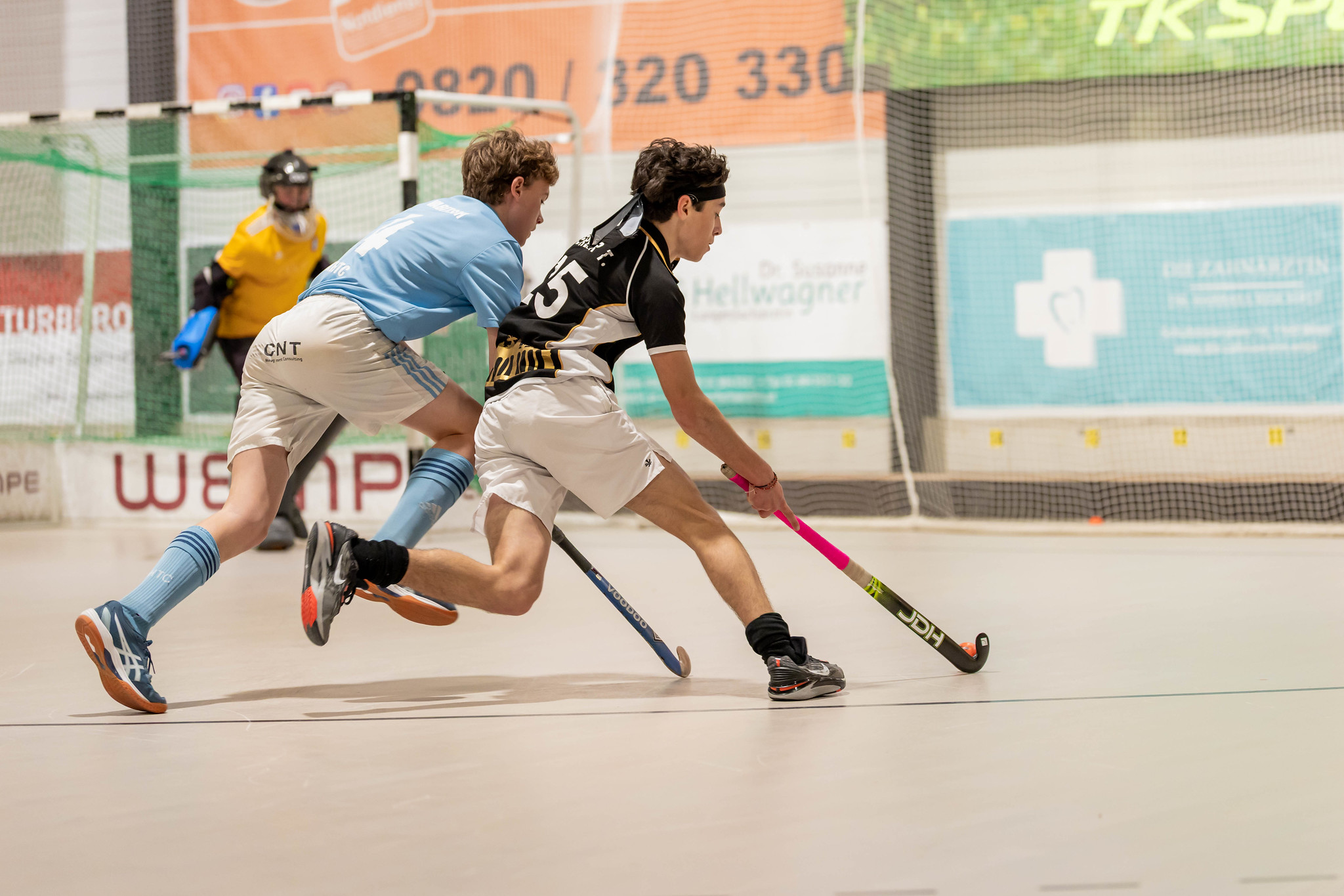 Die erste Chance erspielt sich der WAC, aber der Ball kann vor dem Tor nicht unter Kontrolle gebracht werden. Dann ist der HC Wien am Zug - zuerst prüft Benedikt Meisel den WAC-Goalie und kurz danach wird dem WAC ein Fehlpass im eigenen Kreis fast zum Verhängnis.