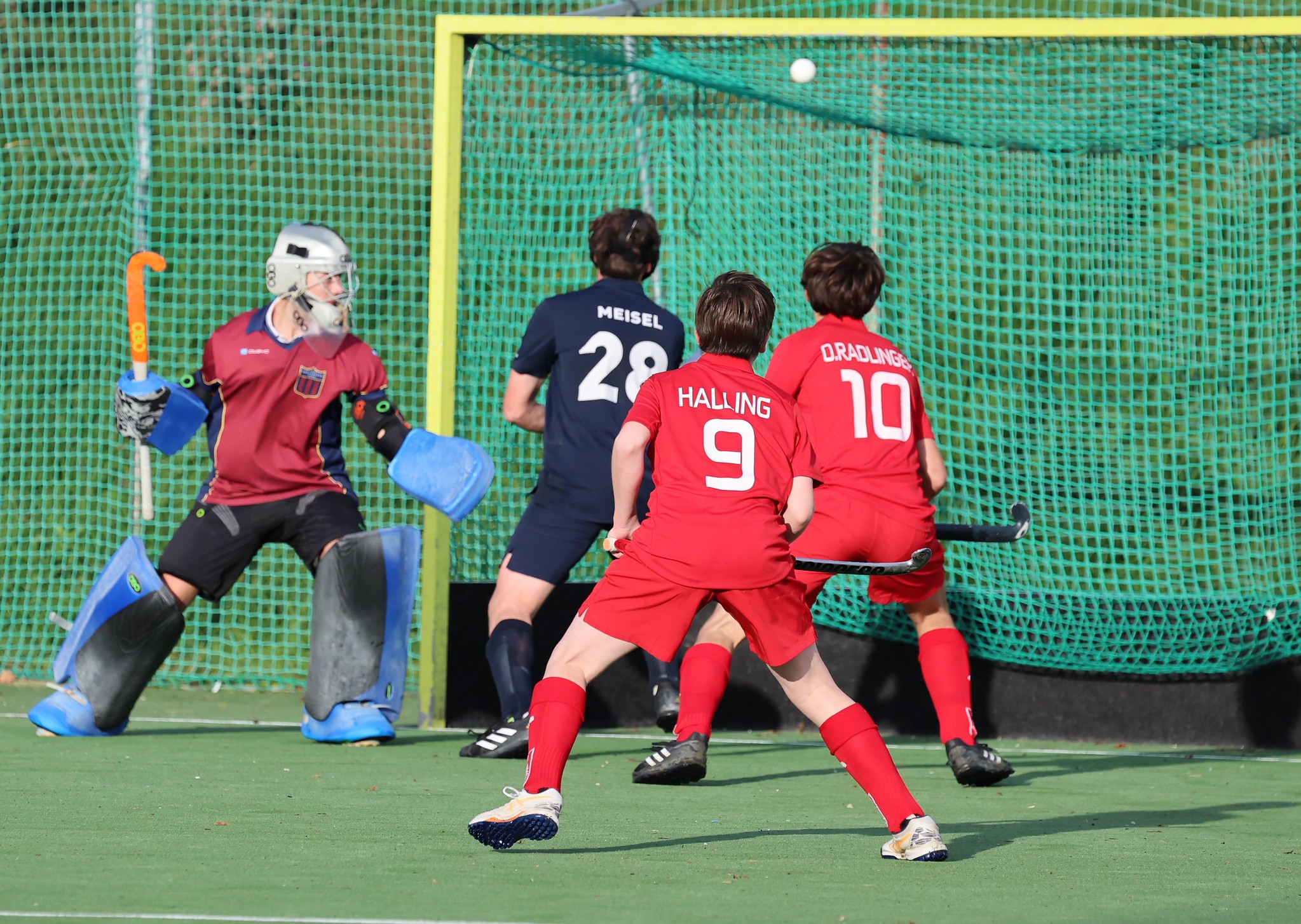 Und Post SV bleibt am Drücker. Sie holen die Strafecke und daraus resultiert eine Wiederholungsecke. Die Variante mit einer kurzen Abgabe des Stoppers verwirrt scheinbar die HC Wien-Verteidigung. Joachim Reiter schlenzt zentral und Tormann Keri lenkt den Ball in das eigene Tor ab. Das ist das 2:0 für Post SV.