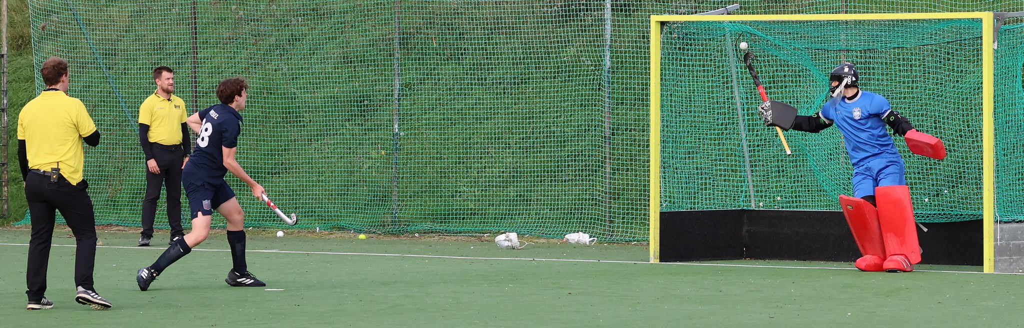 Dann ist wieder Post SV am Zug. Stockschlag und dafür Strafecke für Post SV. Foul beim Herauslaufen und jetzt gibt es den 7m-Pfiff für Post SV. Moritz Geberth geht als Schütze zum Ball und setzt diesen neben das Tor.
