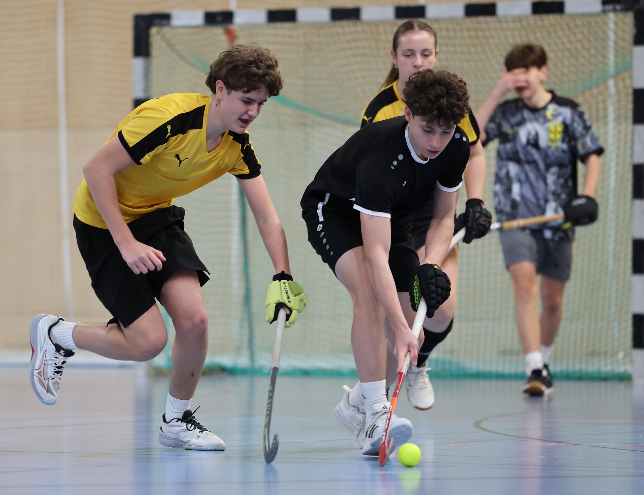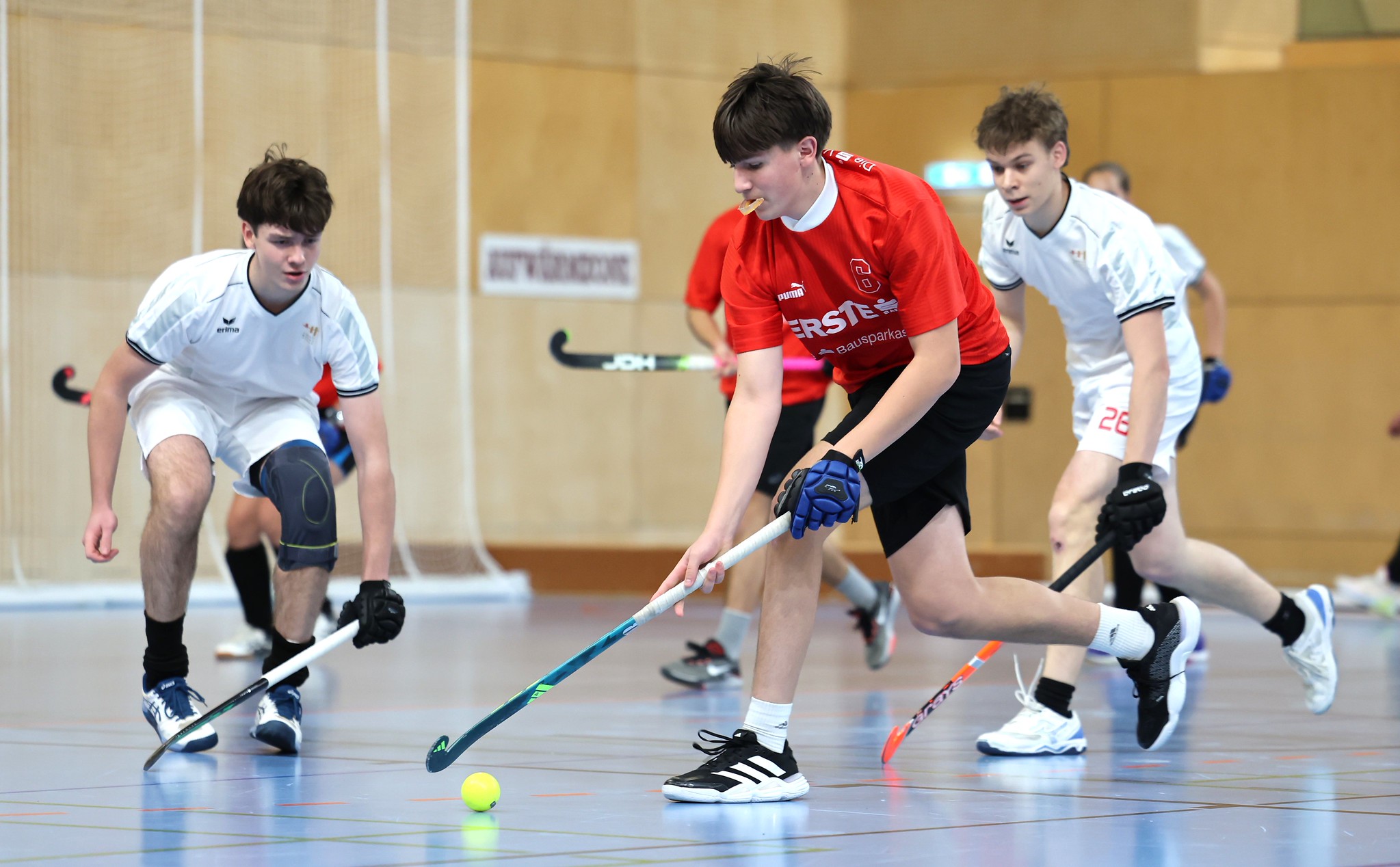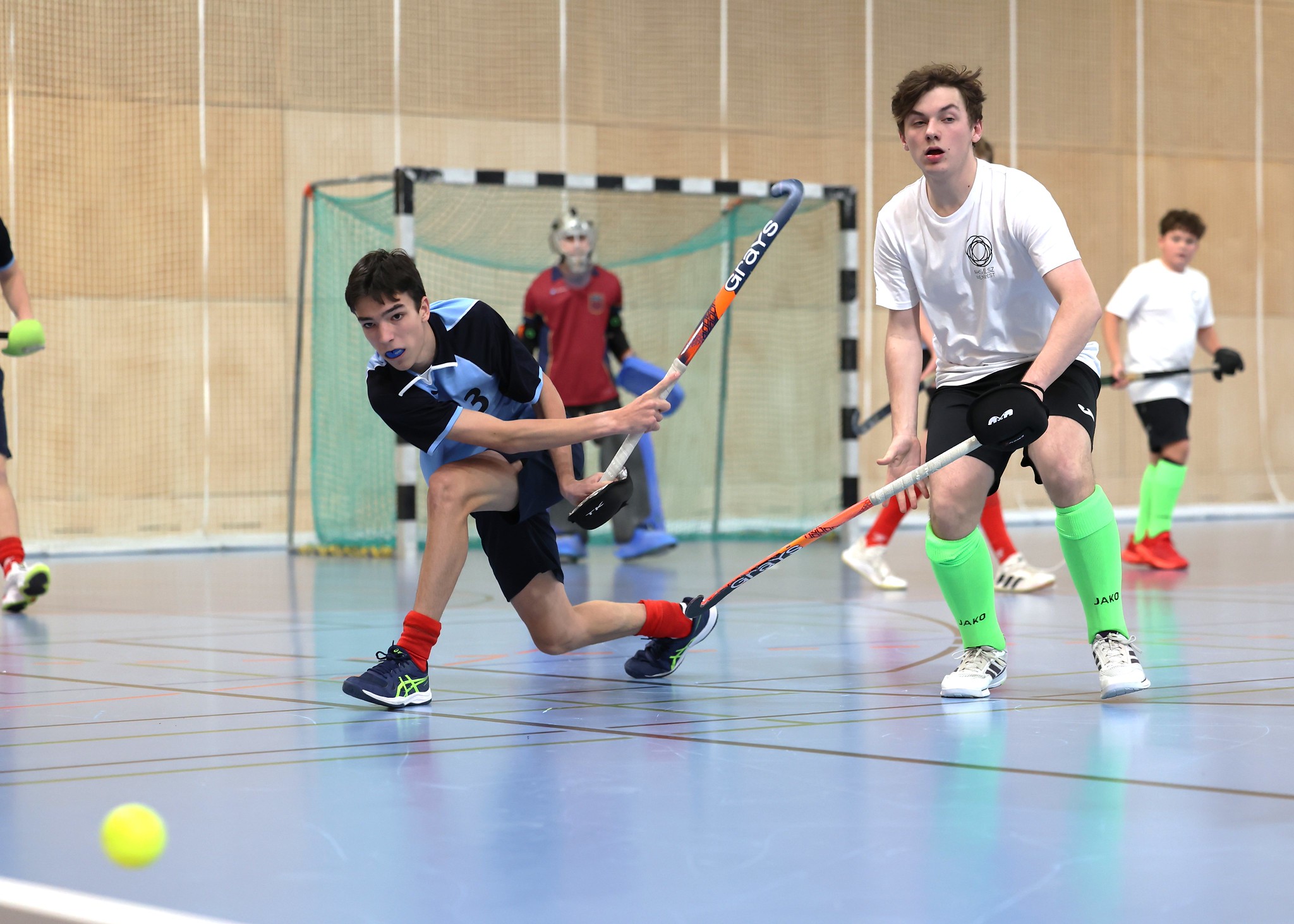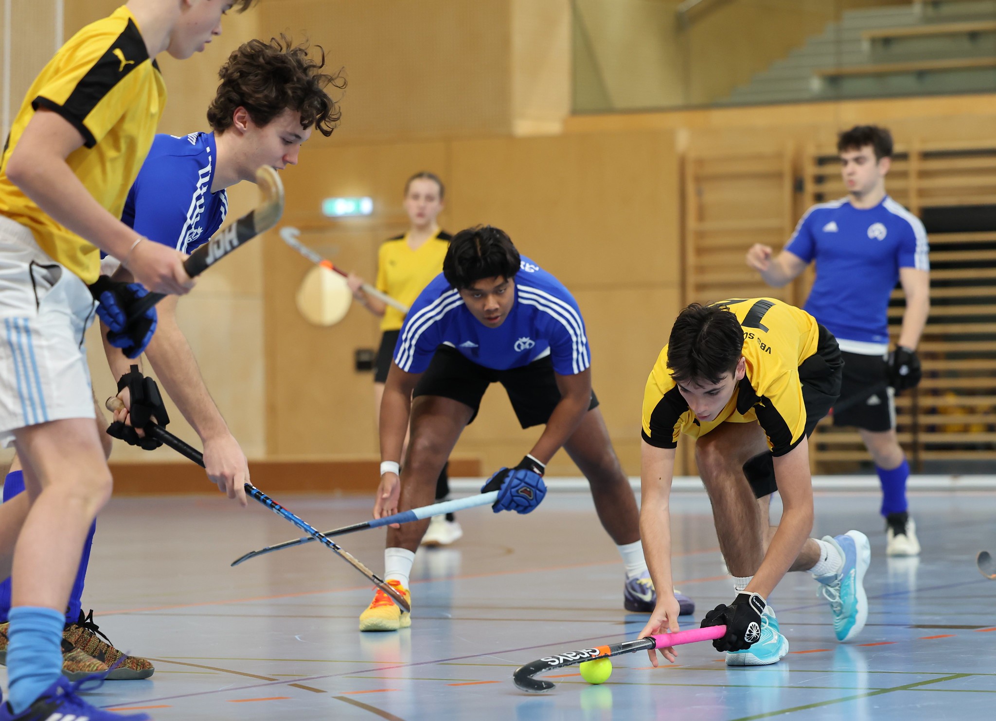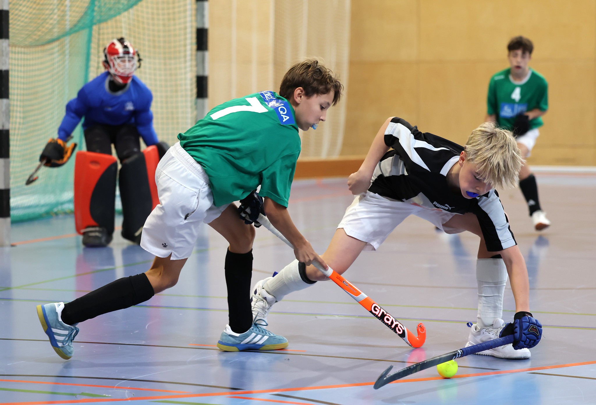 Leider fällt im Unterstufenbewerb der Burschen kurzfristig das Team des Bernoulligymnasiums aus. Der Sieger wird nun aus den vier teilnehmenden Teams ermittelt. Die Spielzeit kann durch den Ausfall von 12 auf 15 Minuten erhöht werden. Im Grunddruchgang wird schon klar, wer hier den Titel ins Visier nimmt. Die starke Mannschaft vom Albertus Magnus Gymnasium lässt nichts anbrennen, kann ohne Punkteverlust ins Finale einziehen und holt sich dort deutlich mit einem 7:1 gegen das BGRG Billrothstraße den Landesmeistertitel.