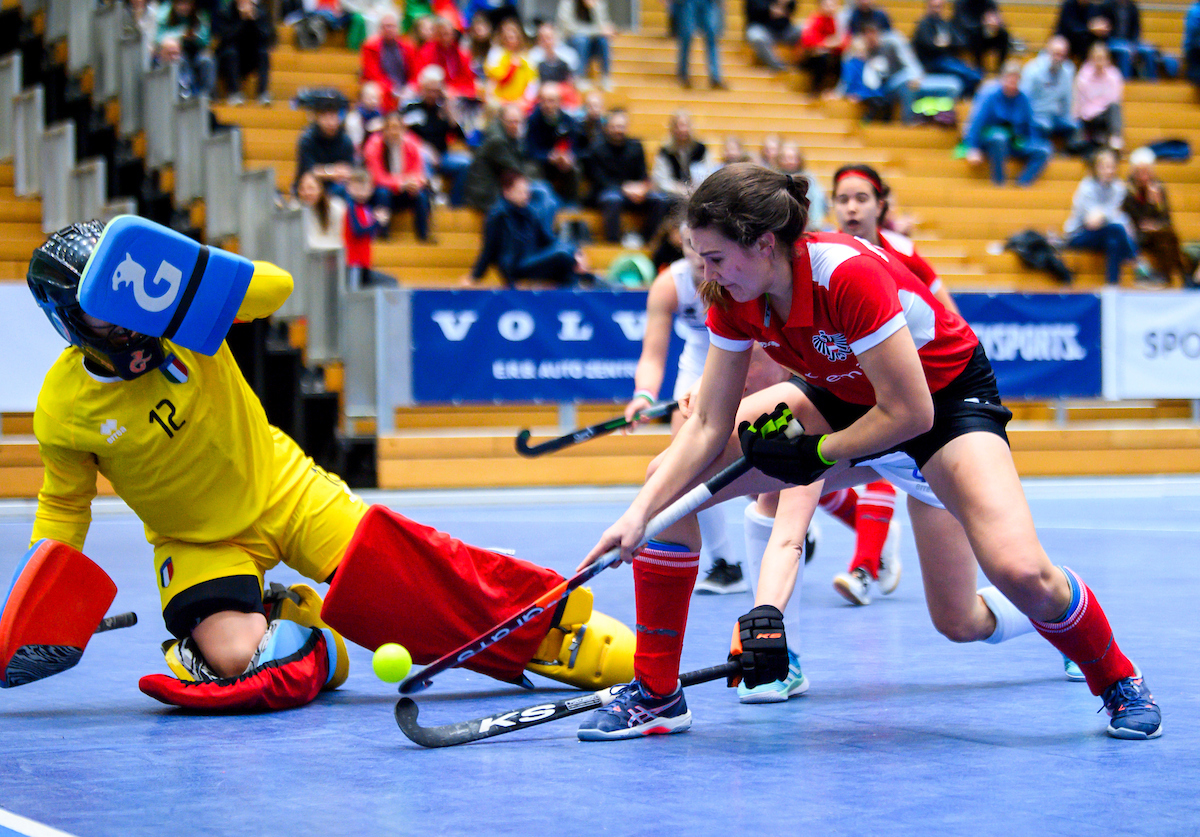 Österreich legt nach - Italien ist mit einer grünen Karte und einer Strafzeit von einer Minute in Unterzahl. Die Red Foxes nützen den Raum über die linke Bande - Marianne Pultar spielt den Ball von der Grundlinie zurück an den Schusskreisrand - dort steht Laura Kern, die den Ball hoch in das Tor befördert.